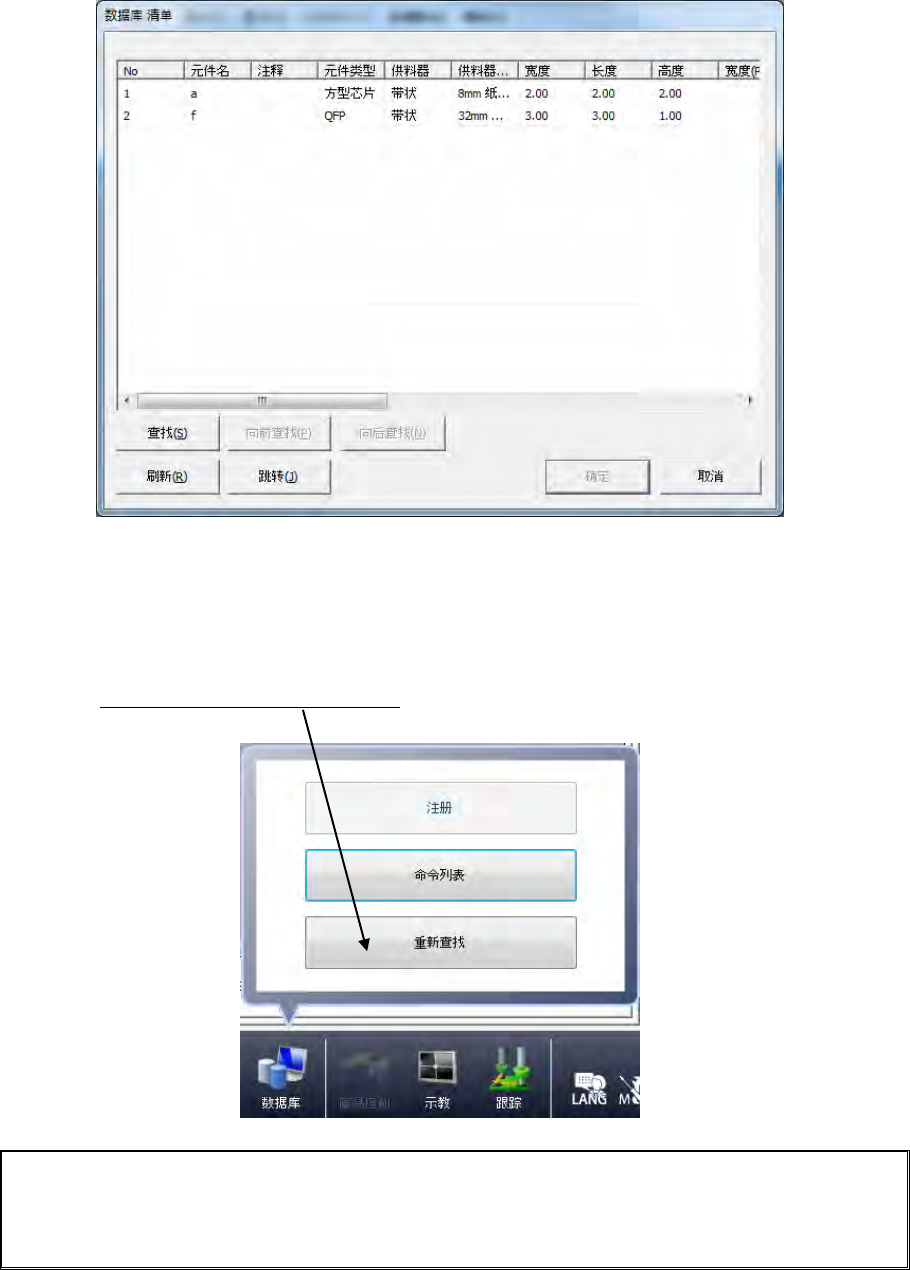 库中调出,注册到生产程序的元件数据中。每执行一次“重新查找”,即对贴片