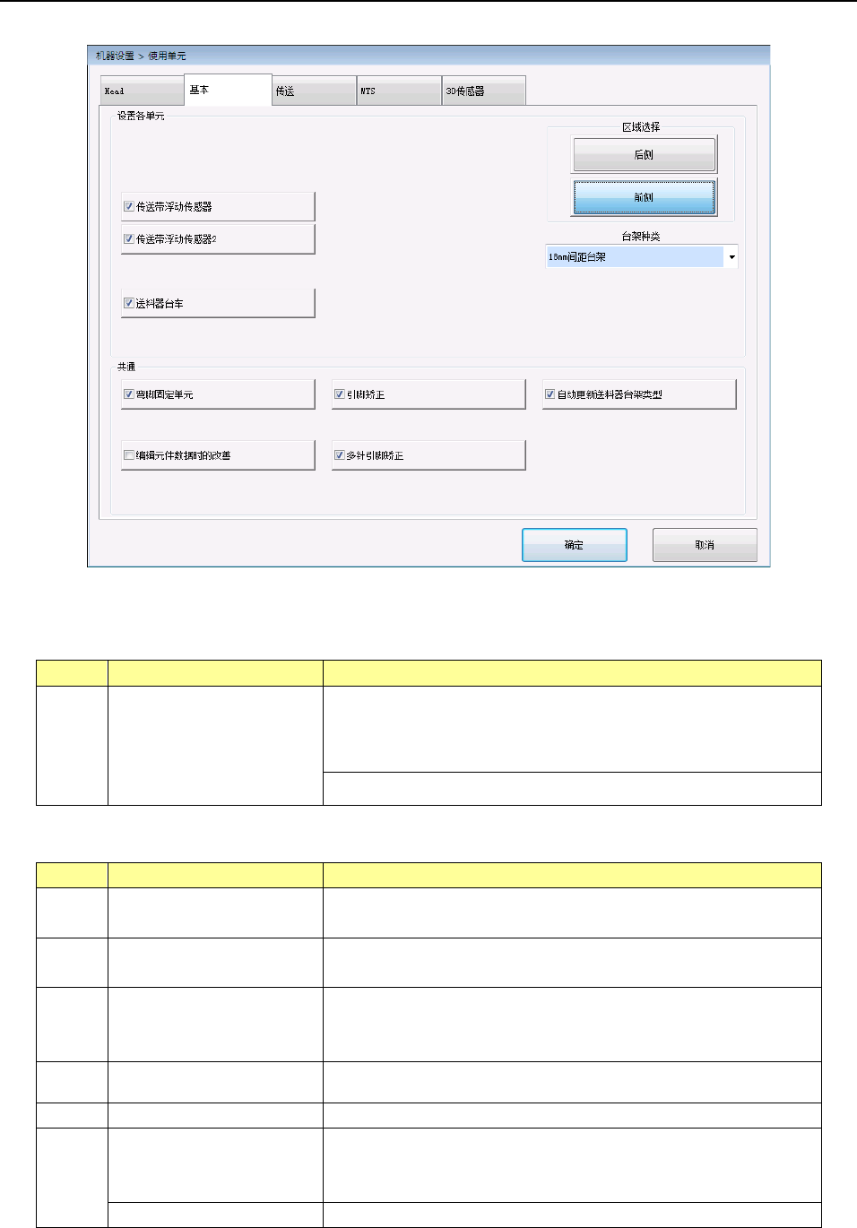 第 2 部 功能详解篇 第 7 章 机器设置 7-8 7-3-1- 2 基本 选择基本,会显 示以下画面。 点击各选项卡, 可指定 [Head] 、 [ 基本 ] 、 [ 传送 ] 、 [MT S] 、 [3D 传感器 ] 。 (1) 设置项目 No. 项目 设置内容 1 基本 指定单元的使用 /不使用。 万一单元发生故 障时,若本项目里设置为 “ 不 使用单元 ” , 可在不变更生产 程序数据的情况下执行吸 取贴片。 指定各台架的台 …