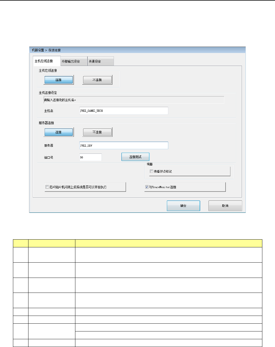 第 2 部 功能详解篇 第 7 章 机器设置 7- 52 7-3-6- 3 在线连接 选择 在线连接,则 显示以下画 面。 在该 画面 ,设定 IFS - NX(I ntelligent Feeder Syst em) 、外部 输出功能。 ※ 有关 IFS - NX 及 外部 输出 功能的设定,请 参照『 IFS - NX 使用说明书 』、『 外 部 输出 功能 使 用说 明书 』。 (1) 设置项目 No. 项目 设置内容 1 主机在…