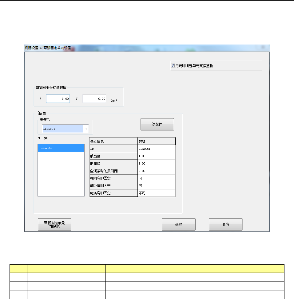 在弯脚固定单元设置画面,可以阅览弯脚固定坐标偏移量、基板支撑功能的有效/无效、读入的
