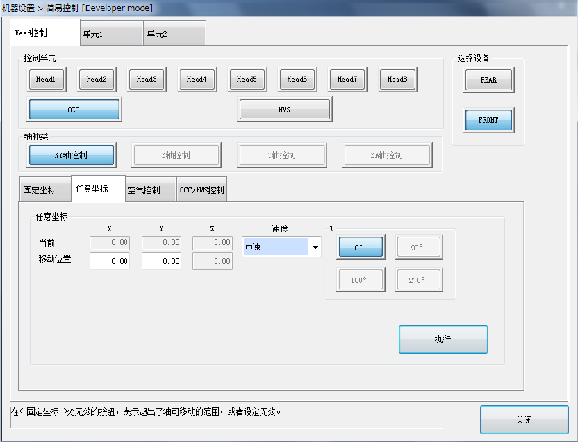 第 2 部 功能详解篇 第 7 章 机器设置 7- 58 选择 [ Head 控制 ] – [ 任意坐标 ] 选项卡, 会显示以下画面 。 按下 [ 执行 ] 按钮,以控 制单元基准及 指定速度 将轴移动到 [ 任意坐标 ] 的移动坐标 上。