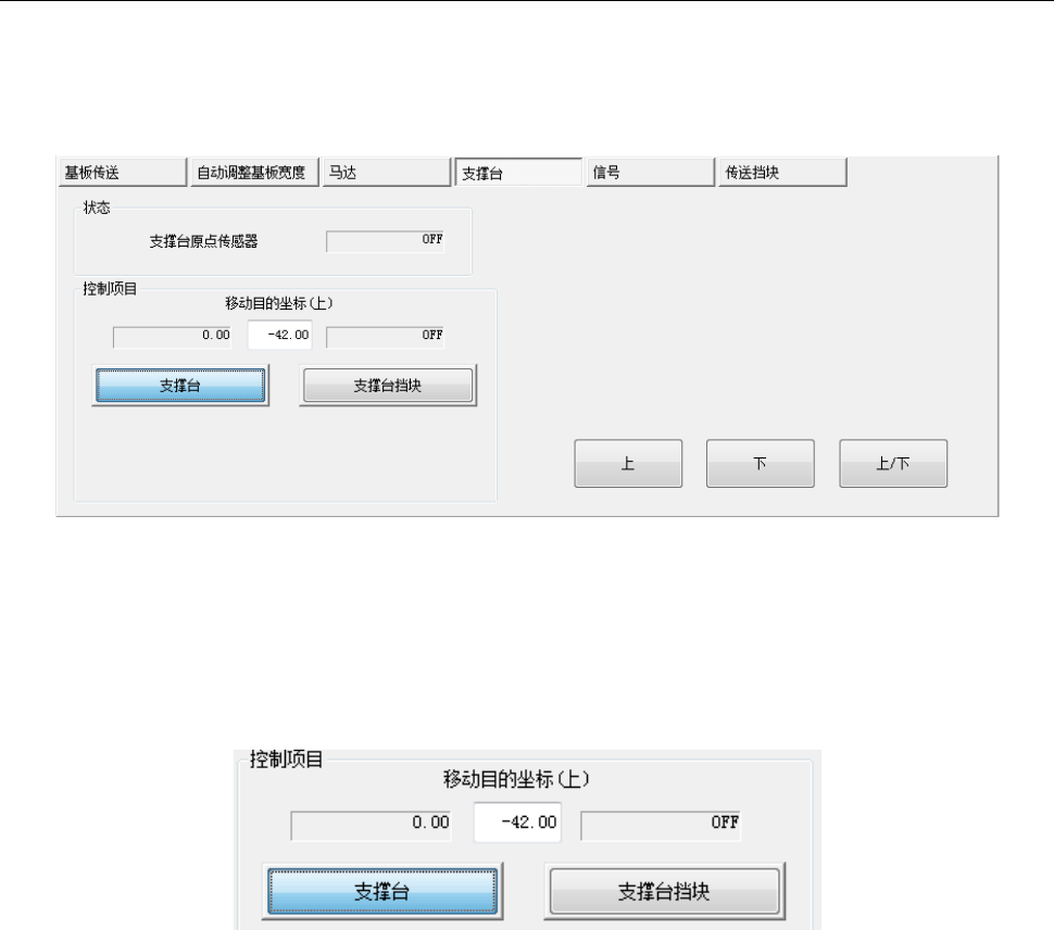 第 2 部 功能详解篇 第 8 章 手动控制 8- 22 8-4-1- 4 控制对象:支撑台 按下 [ 支撑 台 ] 按钮,即可显示 以下画面 。 ※ 安装了 弯脚固 定单元时 ,选项卡名 变为 「夹紧气缸 」, 画面的显 示内容也改变 。 有关详细内容, 请参照「 8-4-1- 5 控制对象: 夹紧气缸」 。 (1) 状态 显示 原点传感器 的 状态 。 (2) 控制 项目 用单选按钮选择 控制项目 。 按下 控制按钮后, 即开始进行…