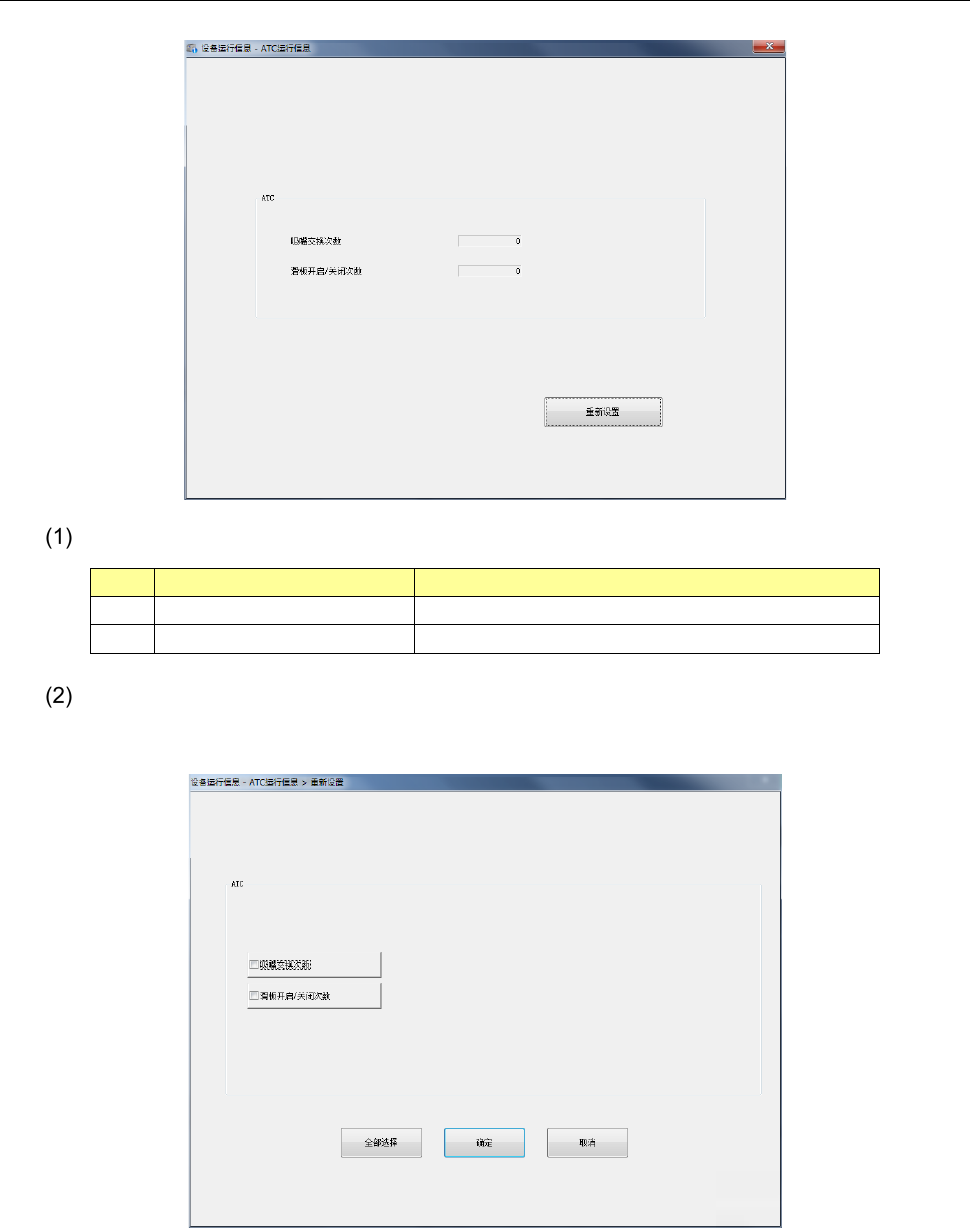 第 2 部 功能详解篇 第 9 章 设备运行信息 9- 23 9-3- 9 ATC 运行信息 选择 主菜单 的 [ 机器 ] - [ATC 运行信息 ] ,即 显示 ATC 运行信息画面 。 ATC No. 项目 内容 1 吸嘴 交换次数 各气缸更换吸嘴 累计次数 。 2 滑板 开启/关闭次 数 滑板开关 累计次数 。 [ 重新设置 ] 按钮 按下 [ 重新设置 ] 按钮或 主菜单的 [ 初始 化 ] - [ 重新 设置 ] ,即显 示…
