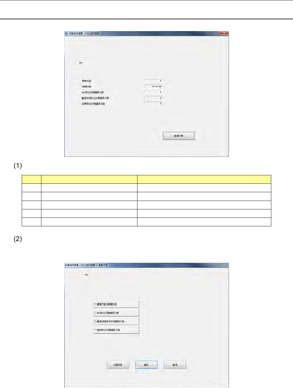 第 2 部 功能详解篇 第 9 章 设备运行信息 9- 25 9- 4 识别 · 检查 9-4- 1 OCC 运行信息 选择 主菜单 的 [ 识别· 检查 ] - [OCC 运行信息 ] , 即显示 OCC 运行 信息画面。 OCC No. 项目 内容 1 OCC 使用次数 使用 OCC 的次数累计。 2 OCC 使用时间 使用 OCC 的时间累计。 3 BOC 标记识别错误 次数 发生 BOC 标记识别错 误的次数累计。 4 基准领域…