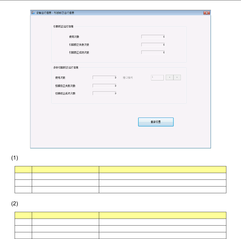 第 2 部 功能详解篇 第 9 章 设备运行信息 9- 31 9-4- 5 管脚矫正运行信息 选择主菜单的 [ 识别 ・ 检査 ] - [ 引脚 矫正运行 信息 ] ,则 显示 管脚(引脚) 矫正 运行信息 画面。 管脚矫正 No. 项目 内容 1 使用次数 使用管脚矫正的累计次 数。 2 管脚矫正失败次数 管脚矫正发生错误的累 计次数。 3 管脚矫正成功次数 管脚矫正成功的累计次 数。 多针引脚 矫正 No. 项目 内容 1 使用次数…