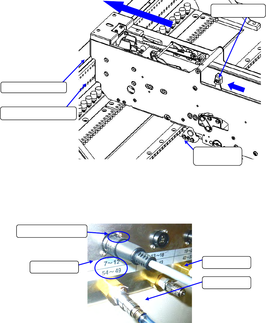 第 2 部 功能详解篇 第 11 章 选项组件 11 -6 4) 在顶住的位置上 将手从紧固把上放开,将 装置固定 。 在顶住固定板的 状态下将紧固把向里推, 直至把杆 回到原来 的位置, 下部的锁定 架③会关闭, 装置即被固定。 ※ 上部护罩上的○,即为装 置安装的通道号。 5) 将从装置后端伸 出的线缆连接到主机上。 将电源线插头方 向对准白点插入连接器。 然后请将气管 插入与装置安装的通 道号对应的插 口里。 气管 电源线 通道号…