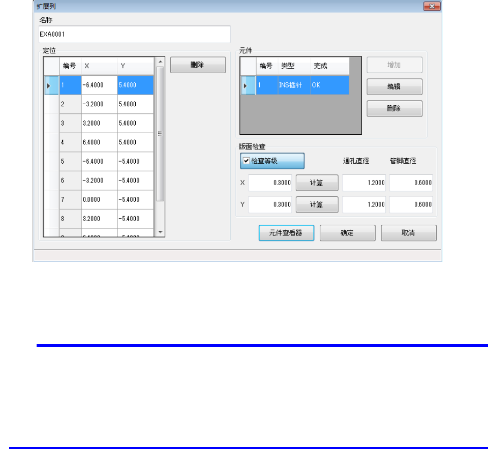 第 2 部 功能详解篇 第 11 章 选项组件 11 - 45 ③ 在 「第一要素的配置」中, 示例中第 1 “球 ” 前端位置为 (- 6.0mm 、- 5 .0mm )时, 按如下输 入: X 偏移量: - 6.0 Y 偏移量: - 5.0 Z 偏移量: 0 (未使用) θ 偏移量 : 0 ・ 允许值 通常设置为 “0 ”。 ④ 「配置检查」 配置 检查 处 初始值为勾 选状态 ( 元件 种类为插入元件 时 ) 。 这是 检查 销的…