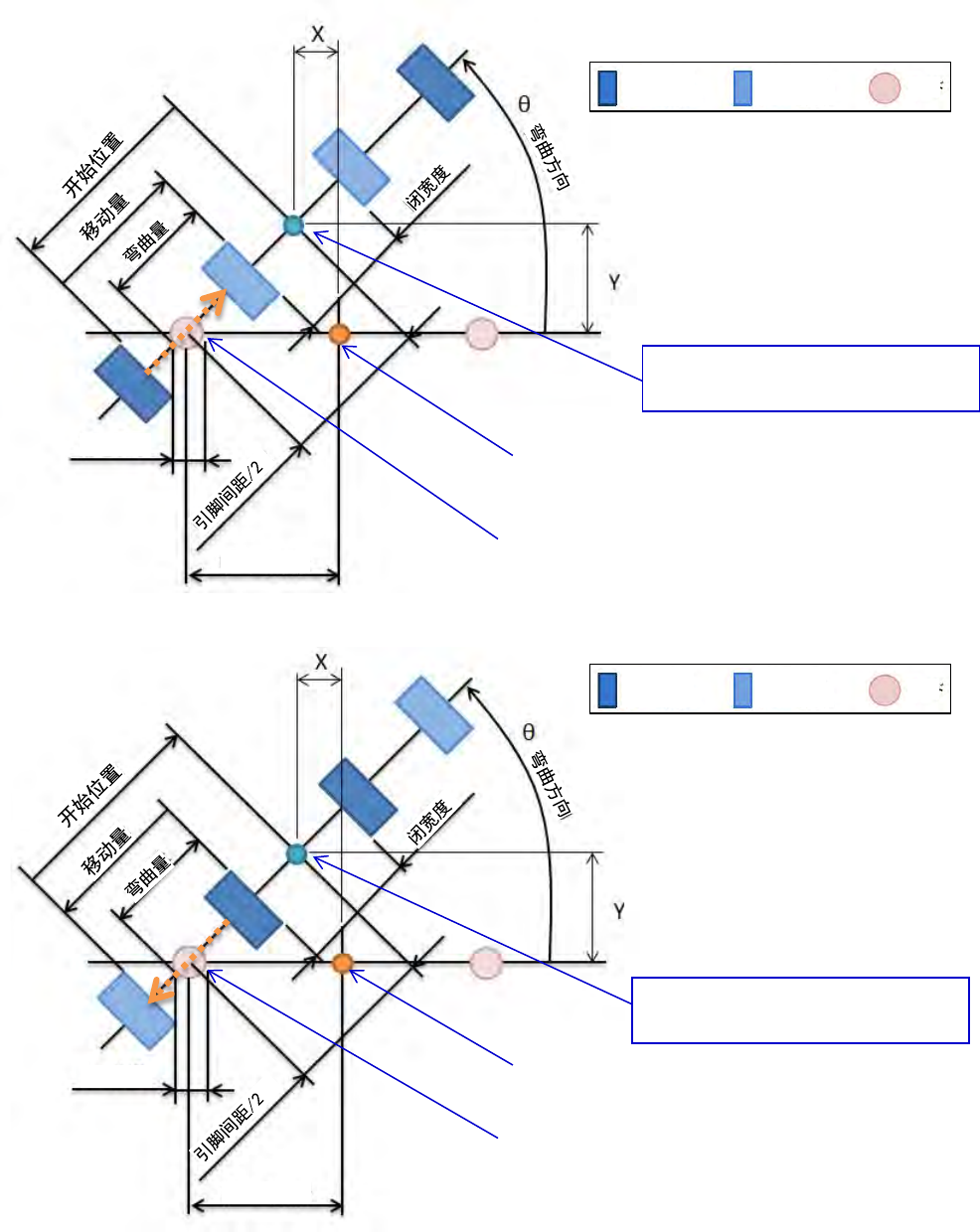 是只要在单引脚画面输入元件为 0°时的引脚位置及弯曲方向、弯曲量,就可以自动计算出弯脚固定头的