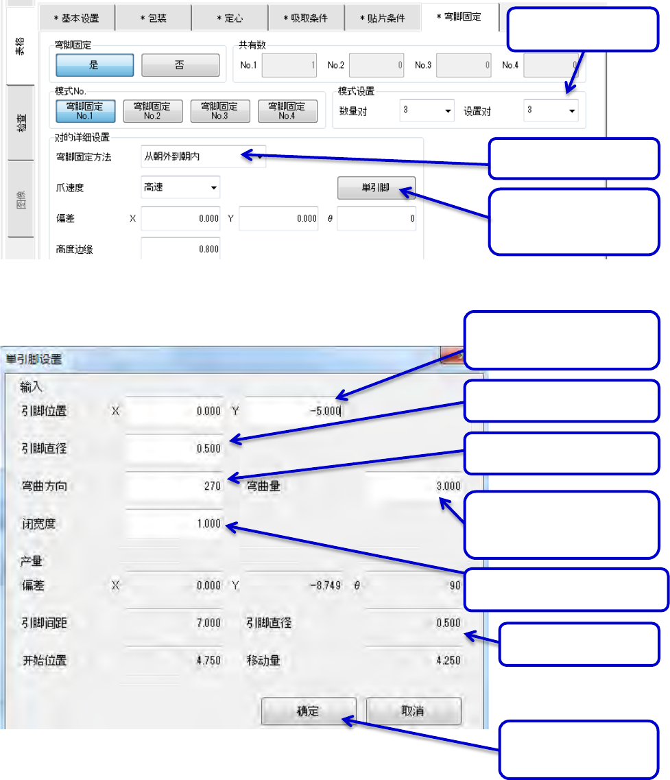 附录 弯脚固定补充 B- 22 ・ 弯曲引脚 E 时 显示单引脚设置 画面。 在输入栏输入引 脚 E 的数据。 设置对:切换 为 3 从朝外到朝内 按下单引脚 按钮, 显示 单引脚 设置画面。 输入引脚 C 的 XY 位置 X:0 、 Y: -5 元件的 引脚 直径: 0.5 弯曲方向: 270 弯曲量: 实际进行弯脚固定, 调整引脚弯曲量。 闭宽度通常输入 1 (默认值 ) 自动计算得出输出。 按下确定按钮,关闭 单引脚设置画面。