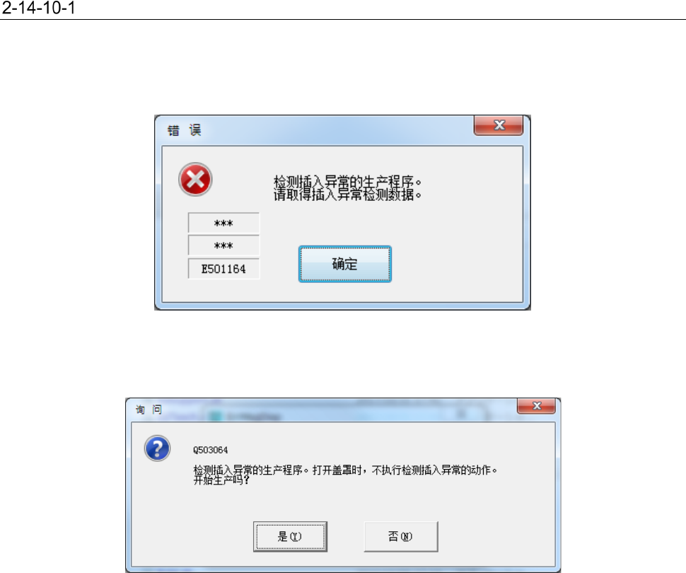 第 1 部 基本篇 第 2 章 生产 2- 159 使用插入异常检测时 如果在元件数据 中, 设定 为使用元件插入 异常检测 , 而 在未取得 插入异常检测数据的状 态下就 开始 生 产时 ,显示 以下的 提示信息 无法开始生产。 此时,请 按下 “ OK ”关闭提示信息, 之后从 程序编辑 或者从 数据 变更 取得 插入异常检测数据 。 取得插入 异常检测数据 之后, 显示以下的提示信息。 请在关闭安全 盖罩后, 关闭 提示信息 并重…