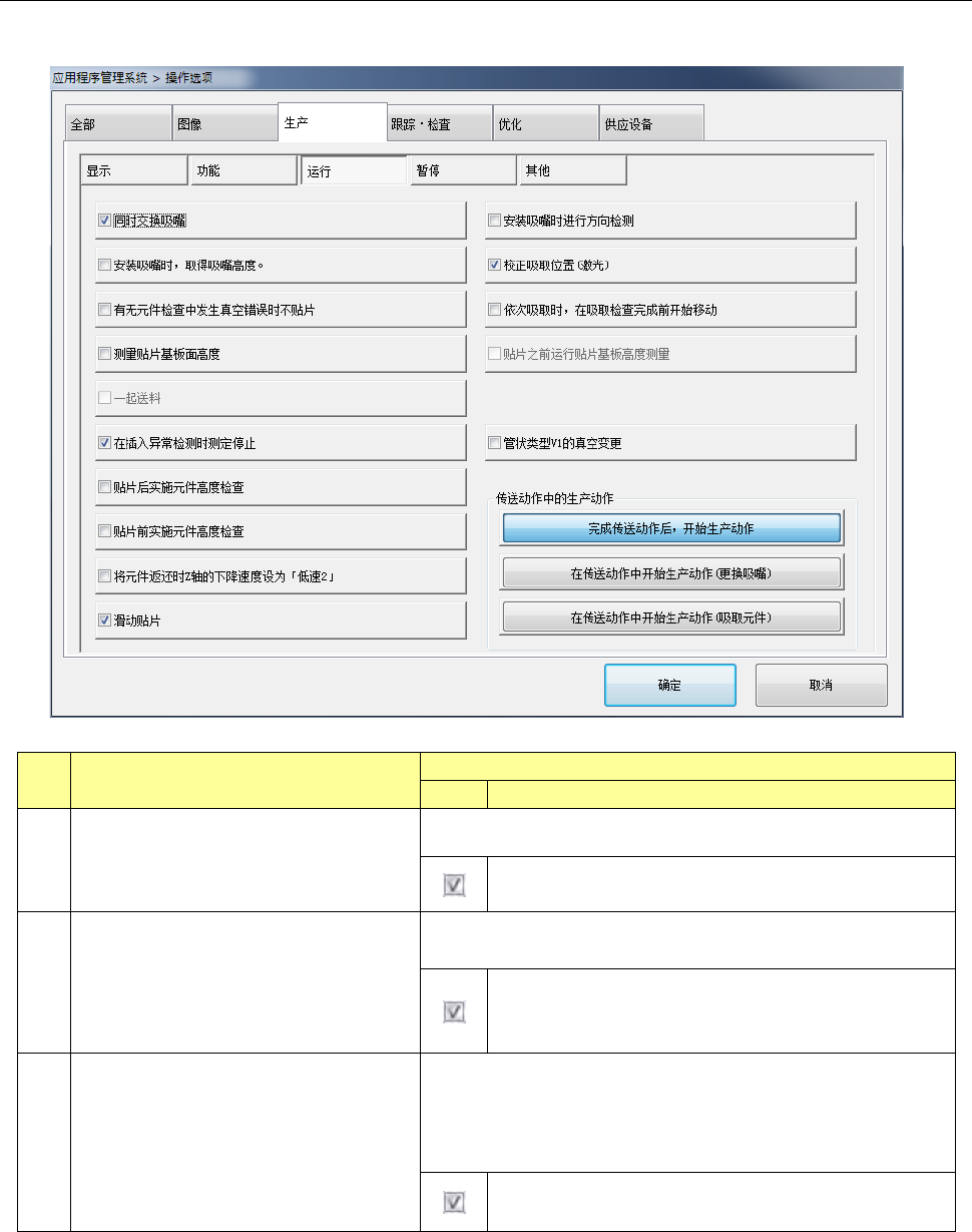 第 2 部 功能详解篇 第 6 章 操作选项 6- 14 6-4- 3 运行 按下[运行]按 钮后,显示 “ 生产运行 选项设置画面 ” 。 No. 项目 内容 状态 动作及详细内容 1 同时交换吸 嘴 设置 是否同时交换 吸嘴 。 执行同时交换吸 嘴。 2 安装吸嘴时 进行方向检测 设置安装吸嘴时 执行方向检测。 安装吸嘴 时执行吸嘴安 装方向检测, 在元件吸 取、 识别、贴片时按 吸嘴的安装角度进行角度 校正。 3 安装吸嘴时 ,取…