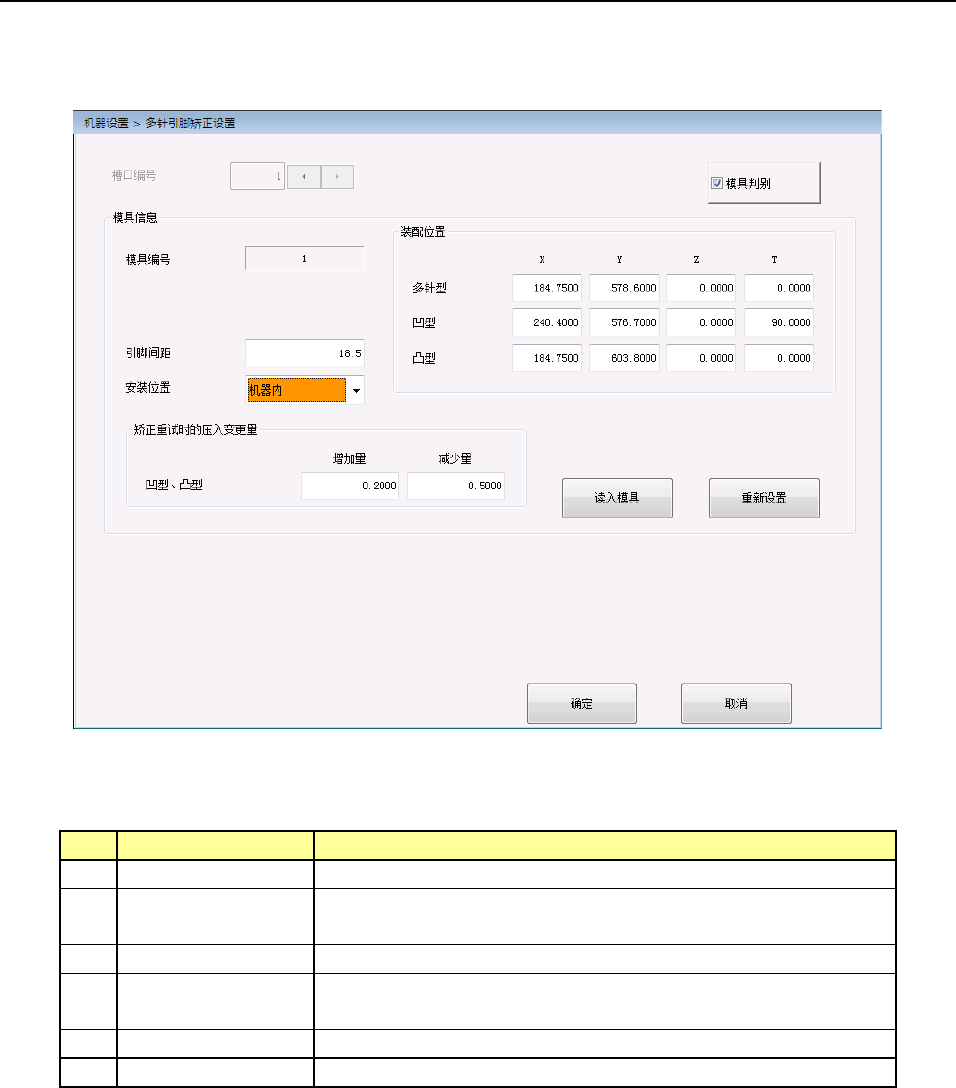 第 2 部 功能详解篇 第 7 章 机器设置 7- 54 7-3-6- 5 多针引脚矫正设置 选择多针引脚矫 正设置,则显示以下画面 。 在多针引脚矫正 设置中, 可以调整装配 位置、 变更矫正重试时的压 入量, 设置多针引脚矫 正模具。 (1) 设置项目 No. 设置项目 设置内容 1 模具判别 设置安装 模具判别动作的 ON/OFF 。 2 装配位置 手动输入或者通 过示教设置模具的装配位 置。 首次读入模具时 ,自动设置初始坐标。…