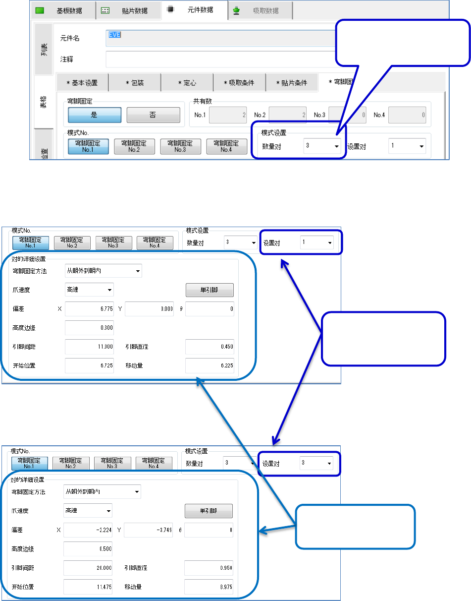 附录 弯脚固定补充 B-3 弯曲 方法是 在 元件数据 的模式设 置处 进行设置的 。 在数量对的栏 内,输入需要 弯曲的 引脚 数。 ( 最多 可以 设为 10 。 ) 设置对为 2 以上时,切换设 置对对每一 引脚进行参数 设定。 在输入第 1 个引脚的 参数时设置对为 1 , 在 输入第 2 个 引脚的 参数时设置对为 2 ,这 样 进行切换。 选择需要弯曲的引脚对 数 ( 最多为 10 ) 对每个 引脚 设置参数。 切换设置对,…