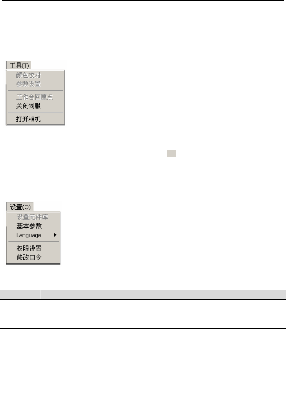 JT 深圳市劲拓自动化设备股份有限公司 (培训资料) 优化路径 :用于对当前程序的路径进行优化。 清除运行记录:用于对当前程序运行中所存下的记录进行清除。 清除样本 :用于清除当前选中坐标的样本。 清除丝印 :用于清除当前选中坐标的丝印。 3.2.1.5 “工具 ”菜单 颜色校对: 参数设置: 工作台回原点:用于将 X Y 工作台回到坐标原点。快捷键: 关闭伺服:用于关闭伺服控制器以及伺服马达电源。 打开相机:用于打开摄像机。 3.2.…