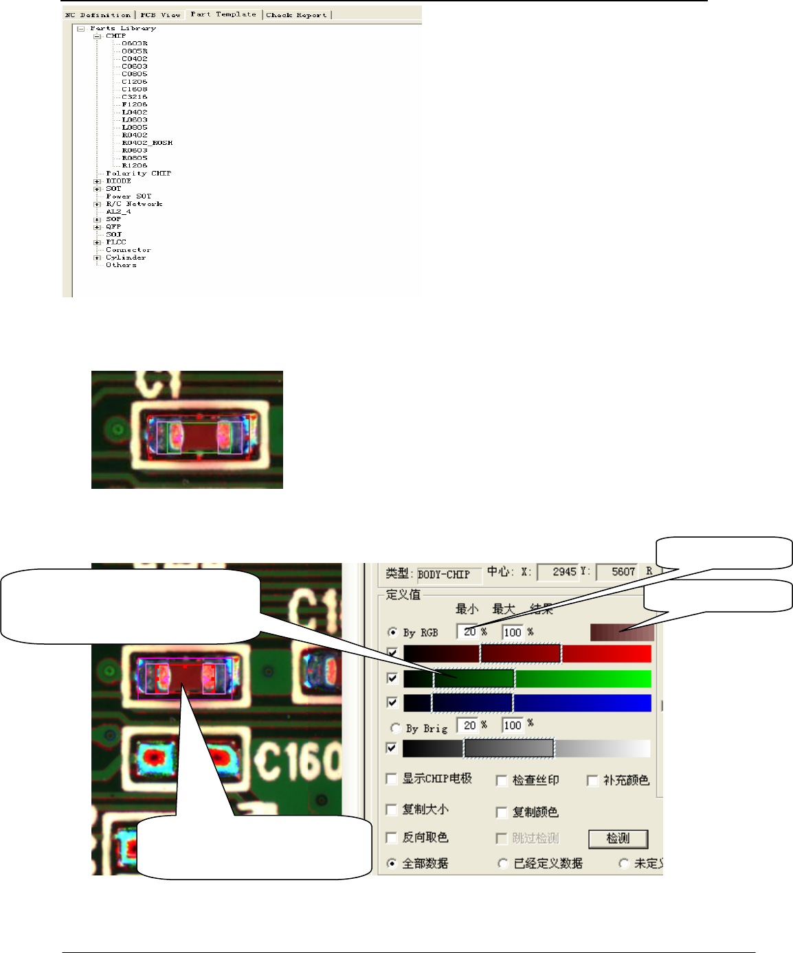 JT 深圳市劲拓自动化设备股份有限公司 (培训资料) 第 34 页 共 54 页 4.4 元件各项检测参数的调整: 4.4.1 CHIP 元件编辑 , 以 C1608 为例: 红色的外框代表元件的搜索范围 ; 一般以背景的焊盘中心为中心。 绿色的框代表元件的本体, 一般 与元件的本体一致,粉红色的框代表元件的焊接区域,但焊接区域必须包含元件可上锡的焊接端。 z 我们首先激活绿色框,在编程检测端如下图: 所选颜色合成范围 可以接受的比例 …