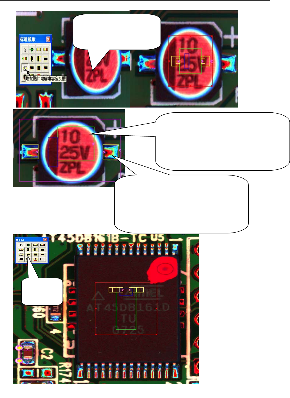 JT 深圳市劲拓自动化设备股份有限公司 (培训资料) 4.4.6 贴片电解电容 首先双击元件的十字坐 标, 使其变成黄色,再单击 “增 加贴片电解电容”钮 4.4.7 SOP 的编辑 将每部分的检测框调整 为和元件一样大 小。如左图。绿色本体先设定本体颜色,再 进行 “丝印取样” , 设丝印值; 蓝色检测框为 极性检测框,将其调整为极性颜色,并对极 性颜色的“最小值”设值; 里面小黄色检测框为定 位框,定位于电 解电容的脚的颜色,大的黄…