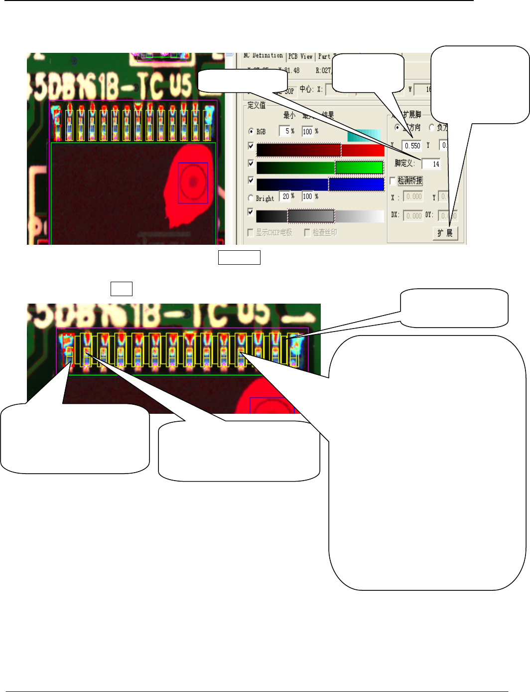 如果要对 IC 脚之间作锡桥检查,需要选择检查桥接。在 X Y DX DY 处输入桥接检测框的尺寸。X: