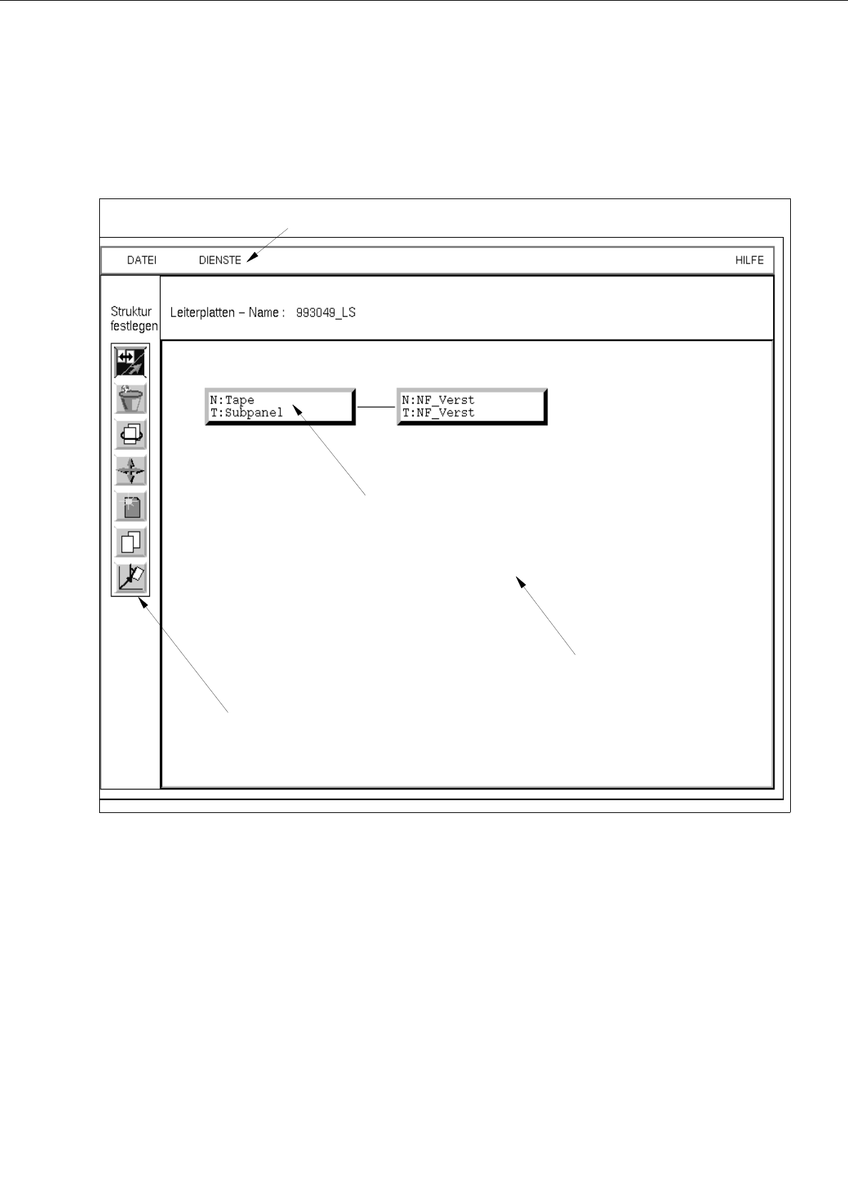 8 Produkt / Leiterplatte Betriebsanleitung Linienrechner UNIX 8.1 Leiterplatten-Editor Software-Version 402.xx Ausgabe 06/96 8 - 8 Menüzeile Die Menüz eile enth ält die Menüs " DATEI ", "DIENS TE" un …