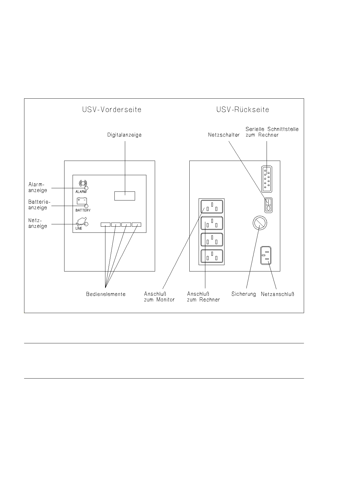 Abb. 1.2.6 USV - Anschlüsse, Anzeigeelemente, Bedienelemente