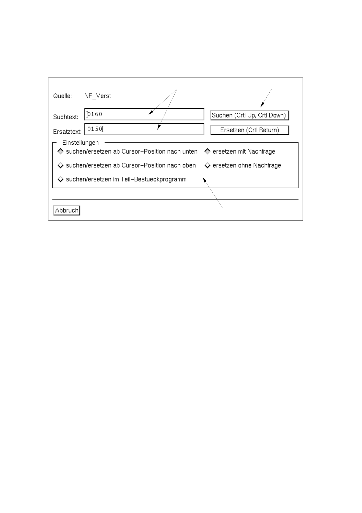 Hiermit wird das Fenster zur Eingabe von Such- und Ersatztexten geöffnet. In den Editierfeldern