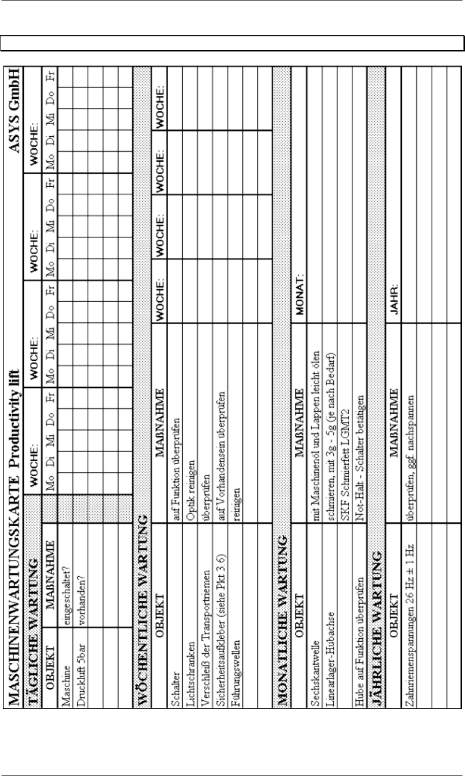 Artikel-Nr.: 00192 168-01 Betriebsanleitung - Productivity Lift SPLFS03_V40_11_0300_200300_V1_14.doc Ausgabestand: 20.03.2000 - Version V 1.14 Seite 89 Wartungsplan ................................ .......... 18, 87 Zwis…