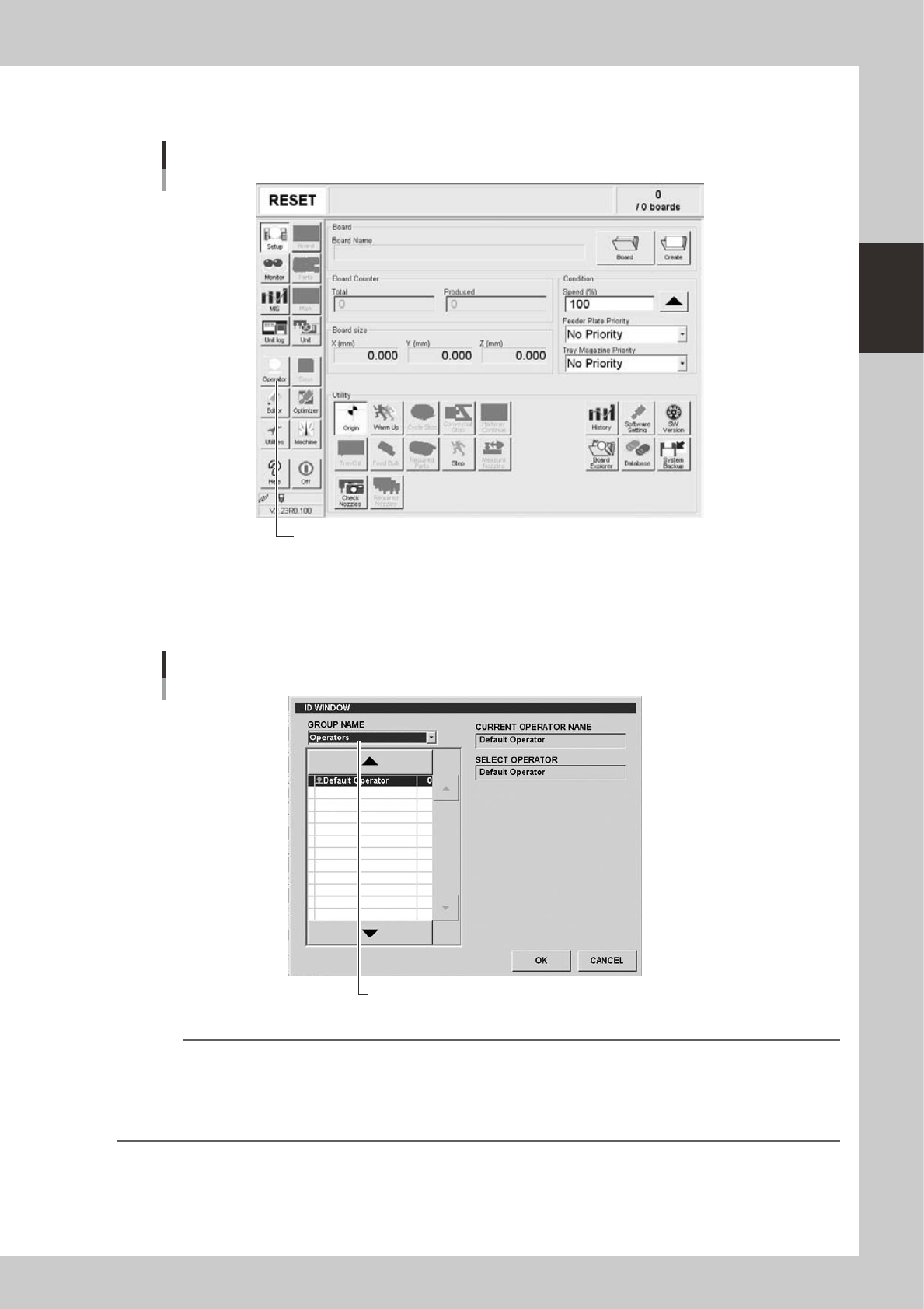 2-19 2 Basic operation 3 Pr e s s t h e [ O p e r a t o r ] b u t t o n . T h e I D W I N D O W d i a l o g b o x a p p e a r s f o r s p e c i f y i n g t h e o p e r a t o r. Press the [Operator] button to open the ID …