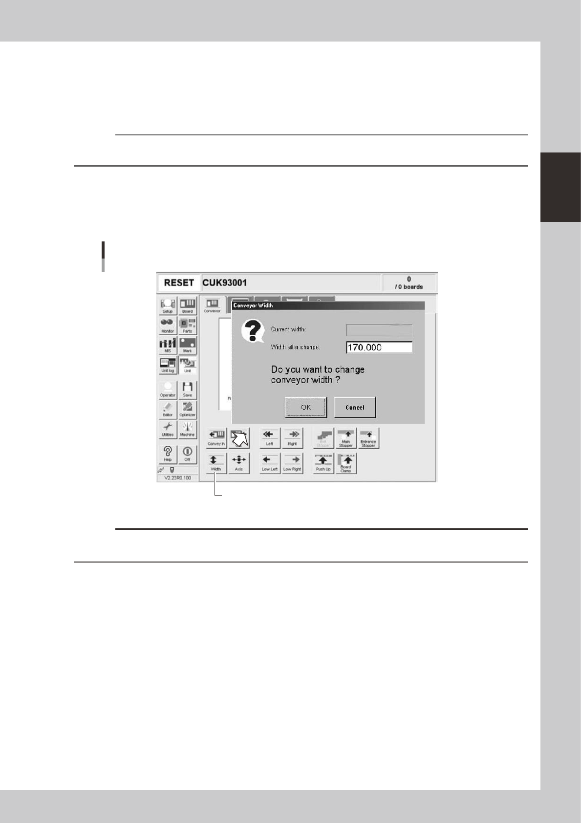 The "Conveyor Width" dialog box appears. Check the conveyor width (units: mm) and press the [OK]