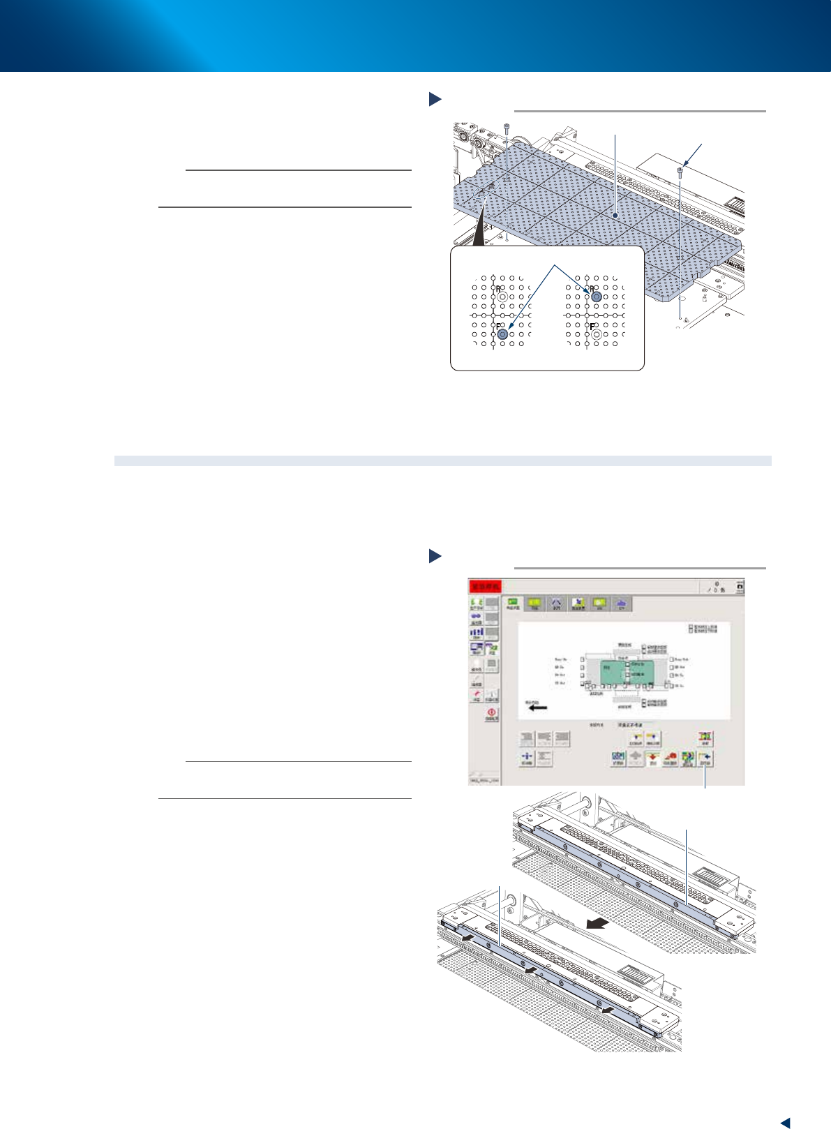 2. 每月需实施的项目 3-4 第 3 章 定期保养项目 2.3 基板压板的动作确认 基板压板 ( 以下简称“压板”) 是从上向下压住基板 Y 方向的两边端来校正基板的向上翘曲。如果压板无法正常 作动,将导致印刷发生偏位。为此,需要定期检查压板的动作和压板感应器是否正常感应。 1 e 进行作业前的准备。 按急停按钮之后,打开安全机盖。 2 确认压板感应器是否正常感应。 1. 按 [ 装置 ] - “传送装置” 页面的 [ 压板 ] 按…