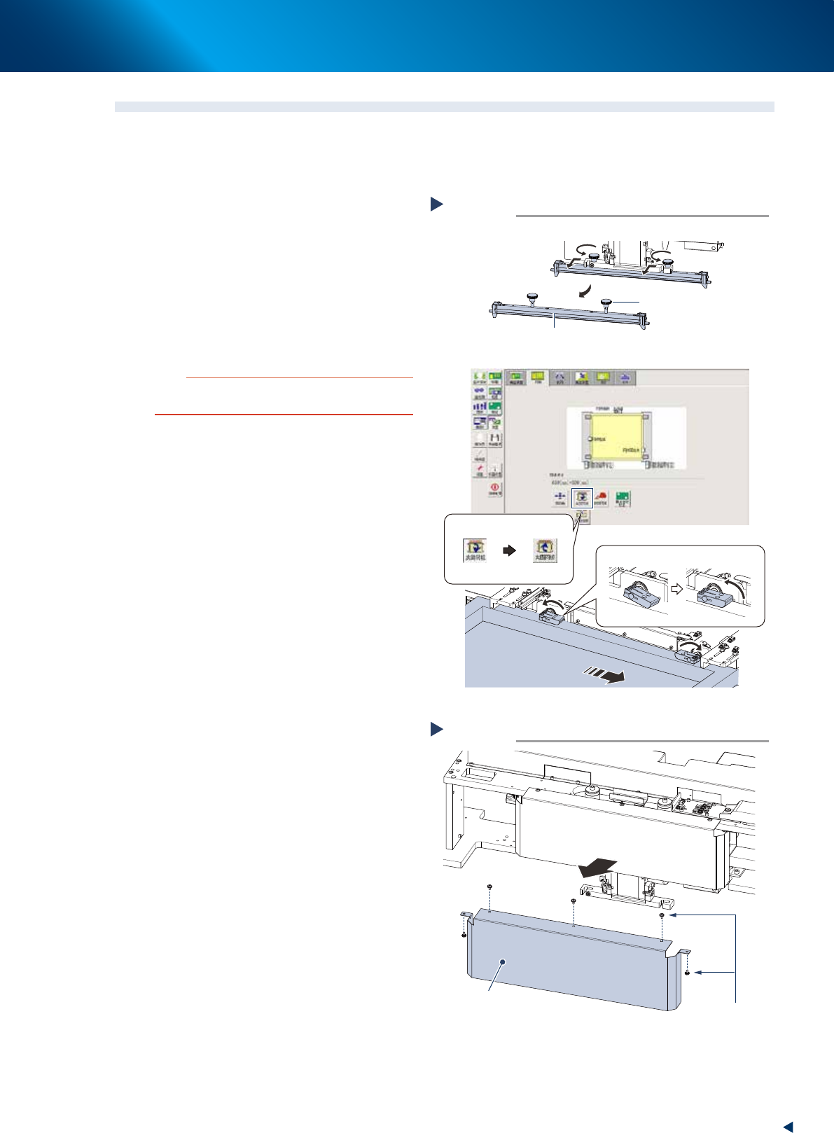 3. 每 3 个月需实施的项目 3-31 第 3 章 定期保养项目 3.5 SZ 轴 下面,介绍对 YSP10 印刷机的刮刀头的 SZ 轴 ( 使刮刀头上下移动的轴 ) 进行清洁与加油的方法。 3.5.1 SZ 轴的清洁与加油 1 e 拆卸刮刀和网板。 1. 按急停按钮,打开印刷机正面的安全机盖。 2. 握着把手, 将刮刀头移动到印刷机正面一侧。 3. 将刮刀的固定旋钮向逆时针方向拧松之后, 从刮刀架上拆下刮刀。 4. 按 [ 装置 …