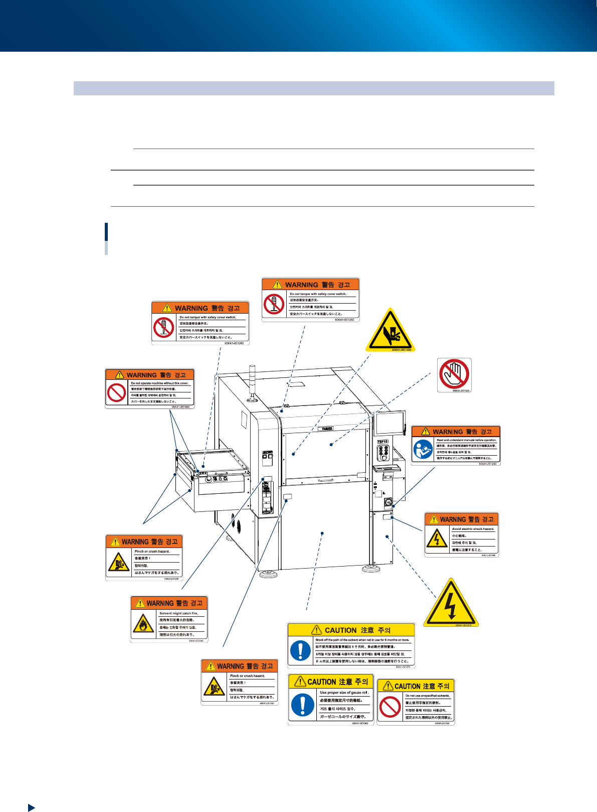 为了安全使用设备,如下图所示,在设备各个部位张贴了警告标贴,务必严格遵守标贴指示。此外,关于本节所