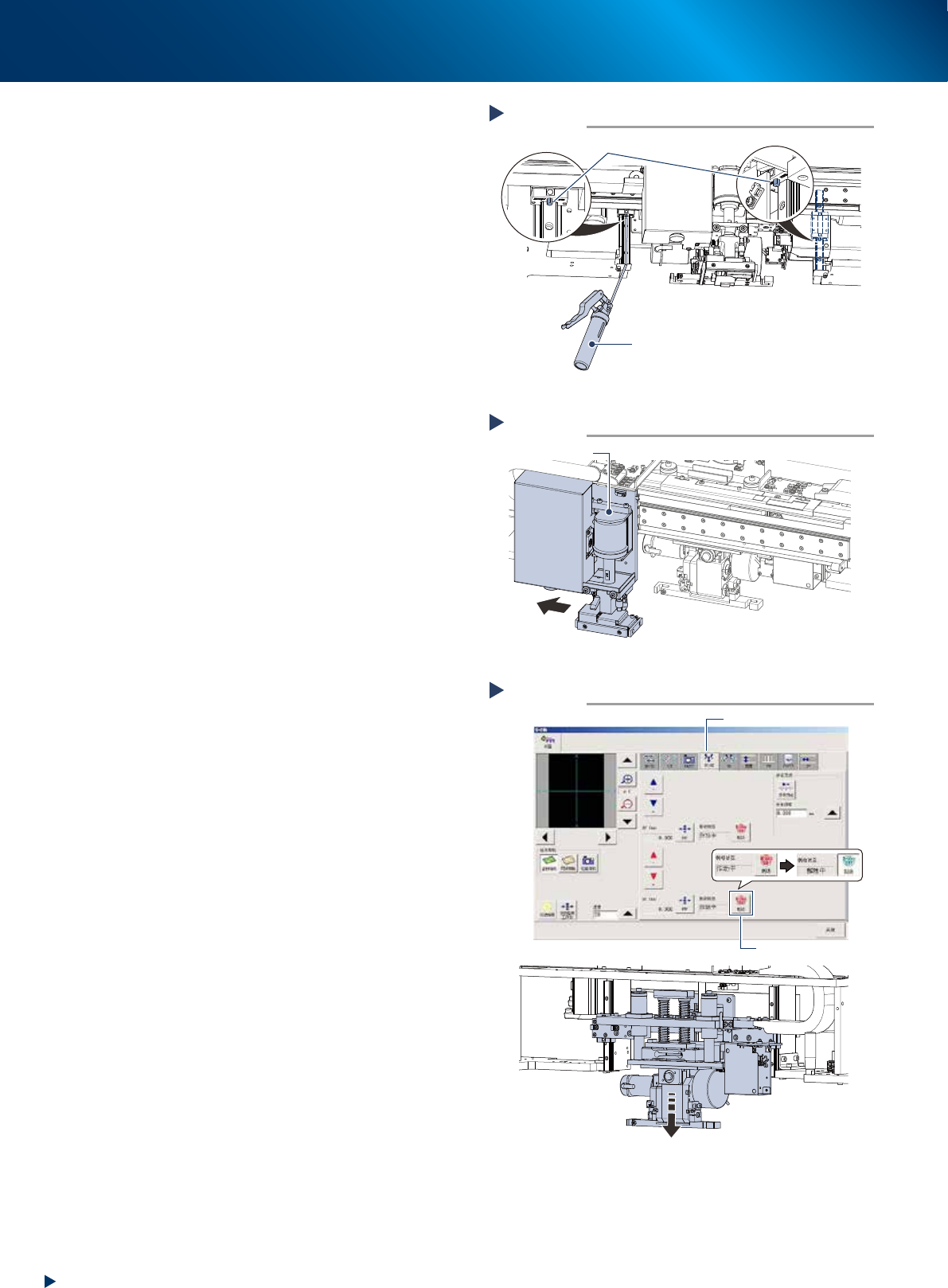 3. 每 3 个月需实施的项目 3-35 第 3 章 定期保养项目 3.5.2 配备 PSC 时 SZ 轴的清洁与加油 选配有 PSC 时,为了便于作业,建议先给 SZ 轴的导轨进行清洁并加油,再给导轴、滚珠丝杆进行清洁并加油。 1 e 拆卸刮刀和网板。 1. 按急停按钮,打开印刷机正面的安全机盖。 2. 握着把手, 将刮刀头移动到印刷机正面一侧。 3. 将刮刀的固定旋钮向逆时针方向拧松之后, 从刮刀架上拆下刮刀。 4. 按 [ 装置 …