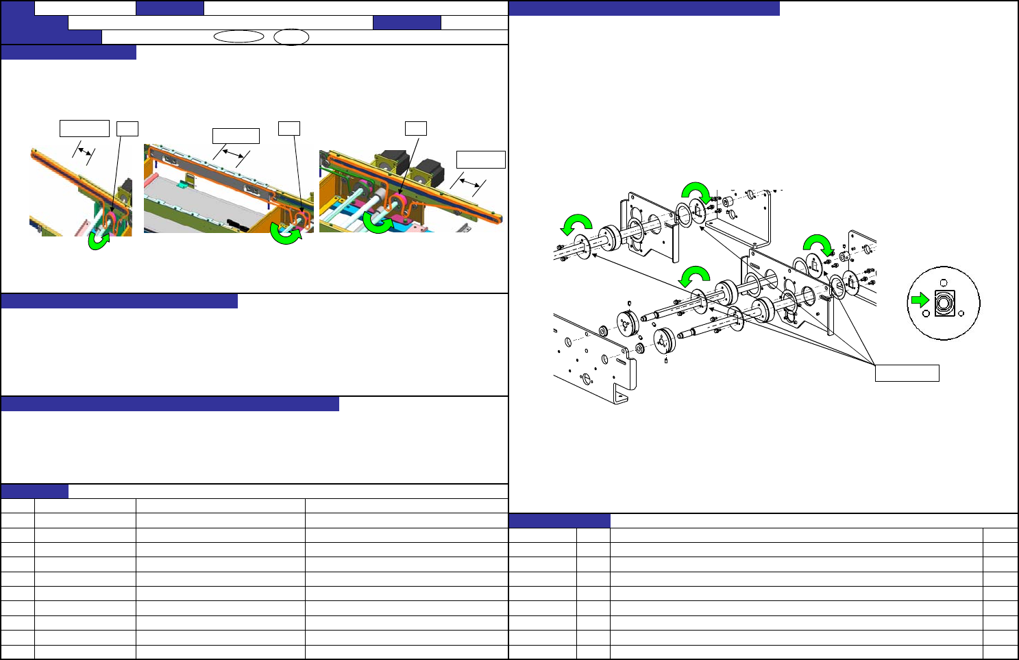 QA表 NO. 10 (1/2) NO. 10 (2/2) 机种 确认方法 1. 在皮带上测定驱动链轮R的松动,确认其已在1mm以下。 ・ 驱动链轮R的松动在皮带上测定时为1mm以下 (压紧驱动轴再旋转驱动链轮R时,下图所示的皮带移动量为1mm以下) 调整方法 1. 将链轮法兰盘按下图的方向转动,要装配得松动为最小。 2. 在皮带上测定驱动链轮R的松动,确认其已为1mm以下。 如在1mm以上,要再次实施第1步的调整。 (注)实施消除松动…