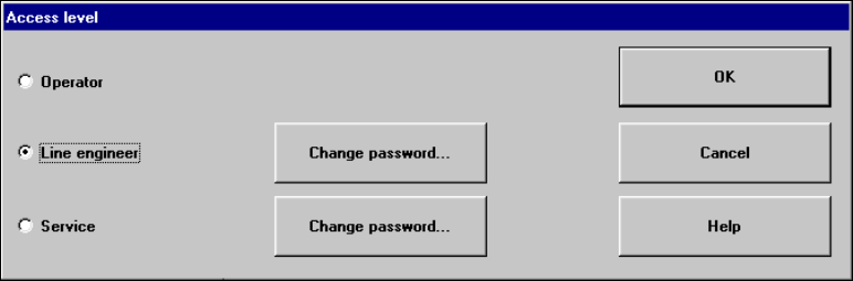 Behörighetsnivåerna "Operator", "Line engineer" och "Service" (Operatör, Ställare och Service-