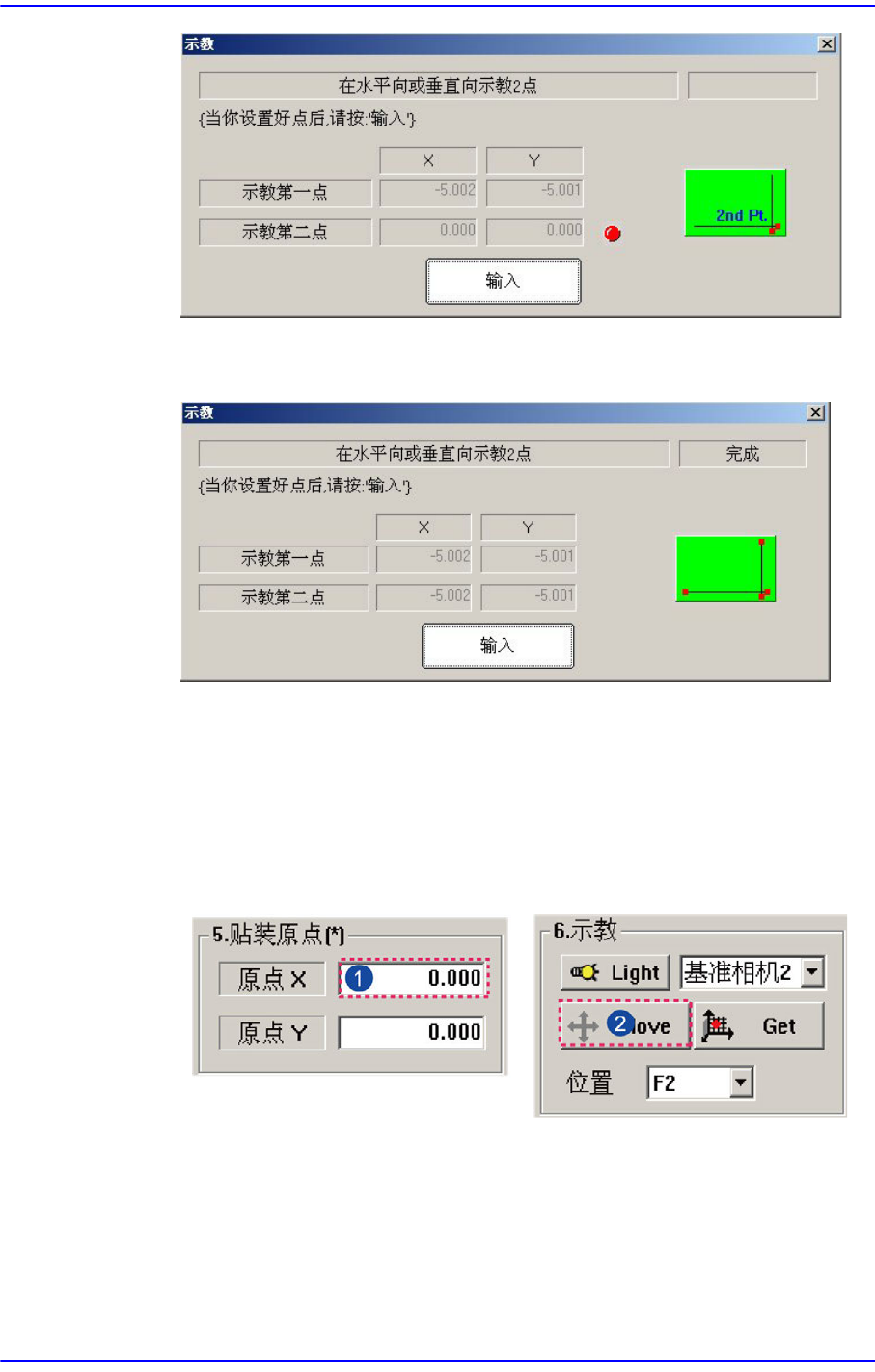 示教PCB上横向,竖向平行位置的2个点中的第一点。示教后,按下” 输入”