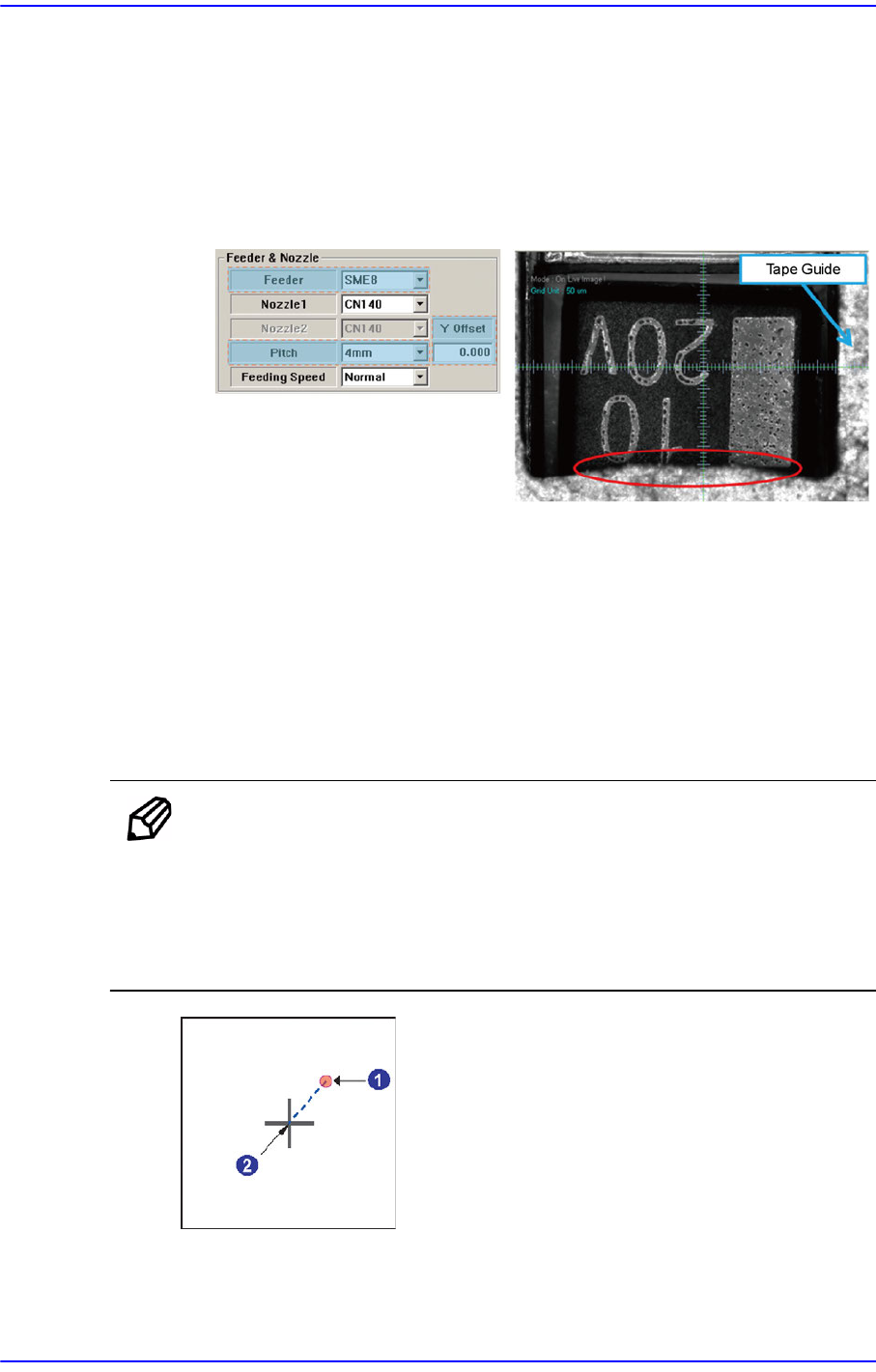 7-12 Advanced Chip Shooter DECAN S2 Administrator’s Guide <Y Offset> 编辑框 把 SME 8mm 或 SME 8mm Large 电动式 T ape Feeder 供料器设定为 4mm 间 距后供应元件时, 如果元件的 Y 尺寸为 2.2mm 以上, 拾取元件时可能与 料带导件干涉。 此时, 在 <Y Offset> 编辑框输入 Y 补偿值以…