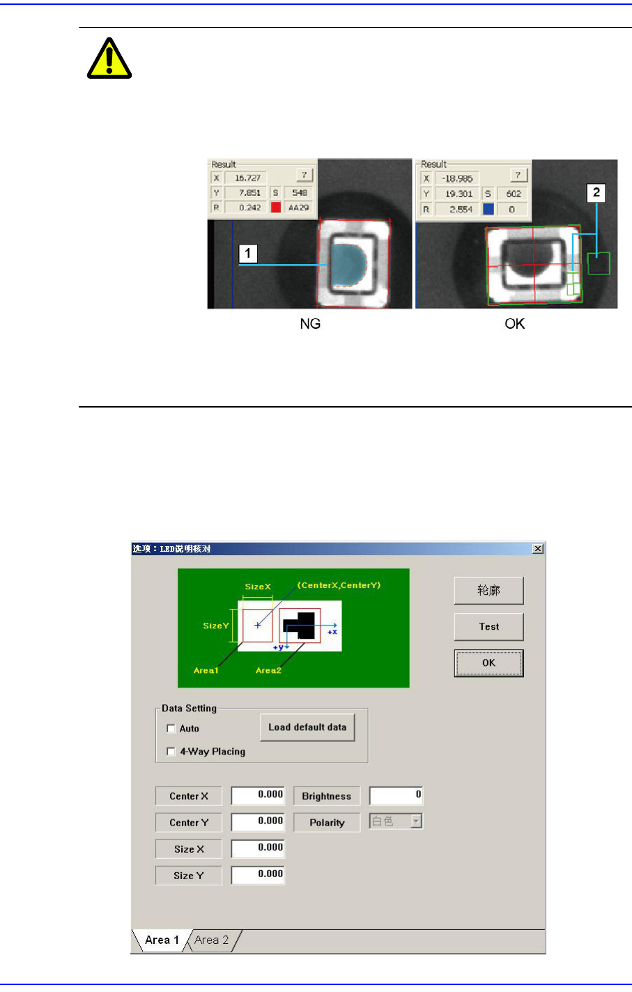 7-41 元件的登记 注 意 即使是像下列图形一样在元件的 Body 上有黑色圆形状的芯片元 件, 也利用 “LED 反面检查 ” 功能登记元件。 否则, 即使正常吸附了元件也会被判定为没 有吸附元件而发生错 误。 1: 把 Body 上的黑色圆形状错误地识别成吸嘴 2: 适用 LED 反面检查功能识别了正常元件 < 细节 > 按钮 执行 “LED 颠倒功能确 认 ” 详细事项设置对话框。 圈选了 <LED 翻转检…
