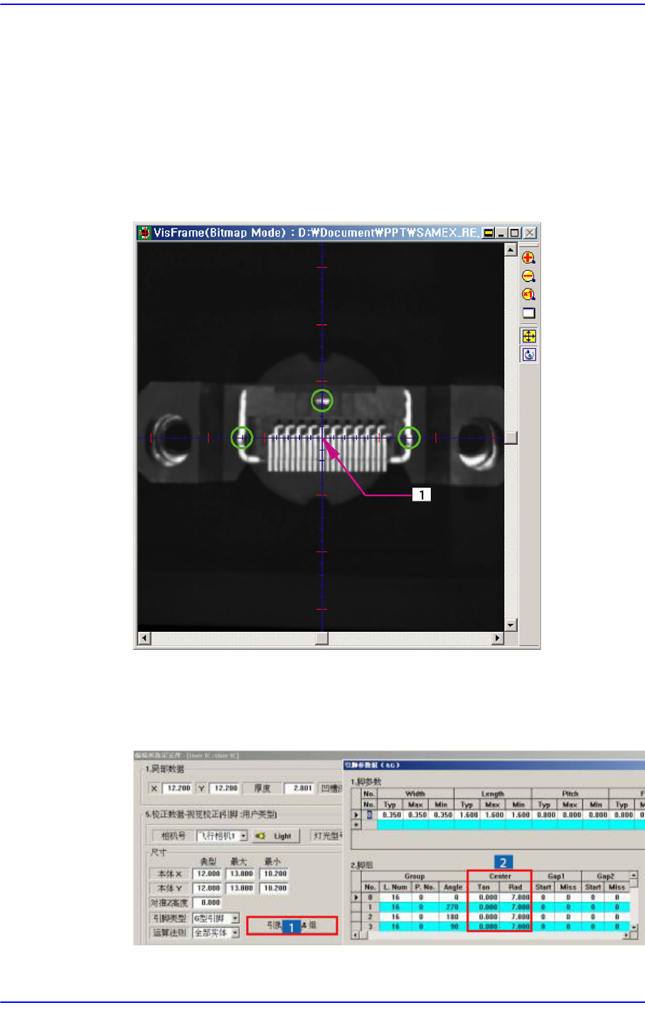 7-73 元件的登记 1: Lead( 引脚 ) 末端 2: 亮区 贴装点示教 在 Step 对话框中选择相应部件的 Reference 点击 <Move> 按钮把 Fiducial Camera 移动到相应位置。 PCB 上适用于该元件的插孔不会全部 显示在 SMV ision 窗口, 因此利用操纵 (jog) 功能如下图所示地把上边的插孔中心设定 为贴装点的 X 坐标。 利用操纵 (jog) 功能往 Y …