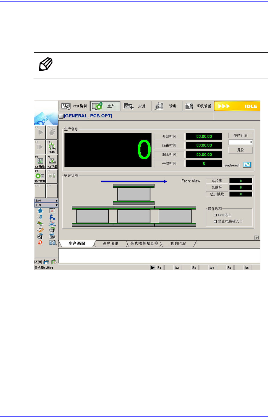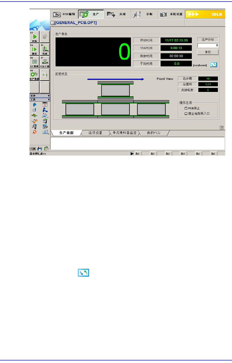 13-2 Advanced Chip Shooter DECAN S2 Administrator’s Guide 13.1. Product Main 13.1.1. Product Monitor 提供与 PCB 生产相关的进程及生产情报。 备注 显示在画面上的传送带形状 会根据选项而不同。 图 13.3 “ 生产 ” 画面 ( 初始画面 ) 选择 ‘PCB 下载 ’ 子菜单时, 将把当前编辑的 PCB 数据传送到设备 。 同时, …