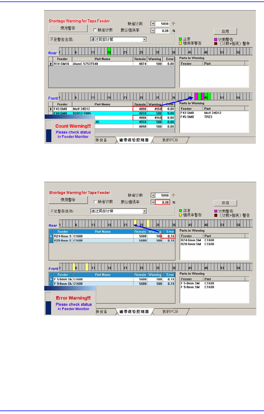 显示已贴装Tape Feeder 的部件剩余量,可设置警告部件不足的部件剩余量,监控与