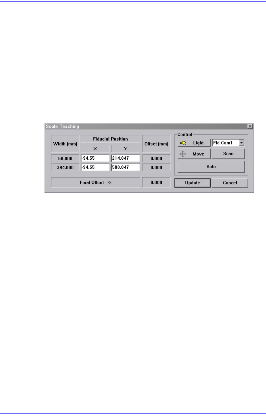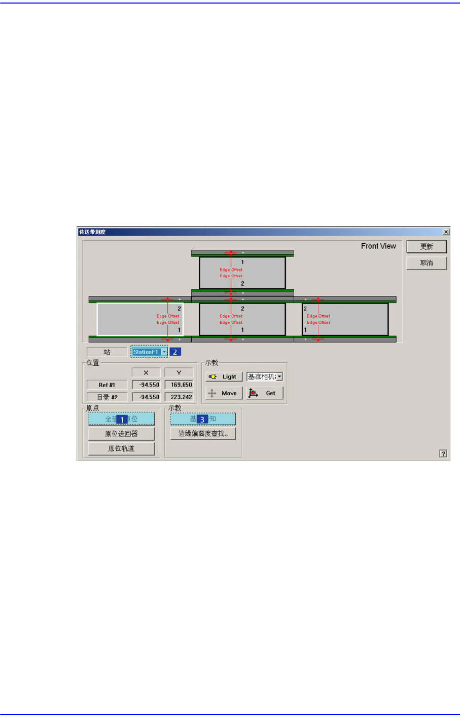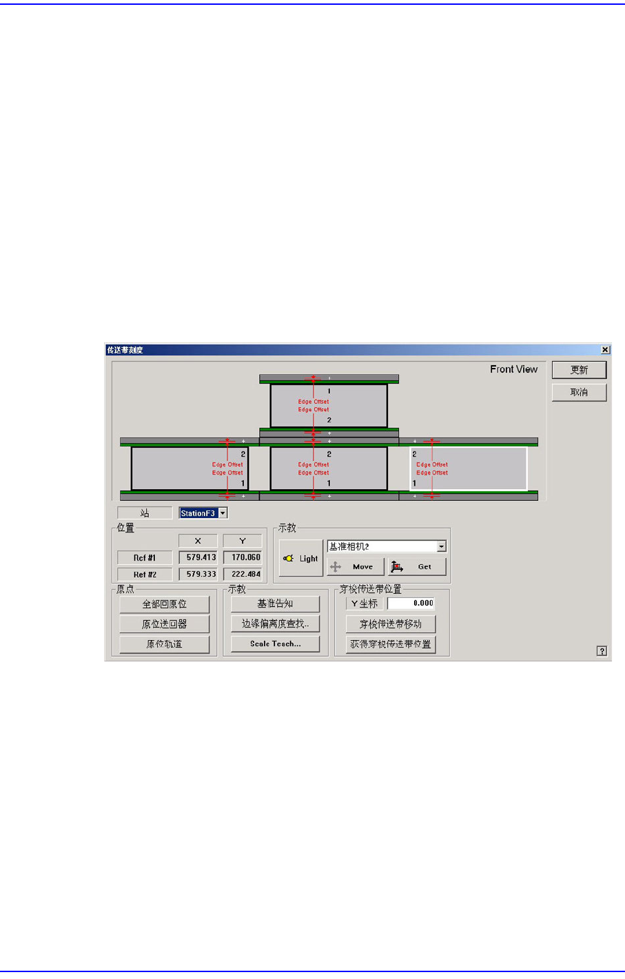 扫描 <Fiducial Position> 所选择的输送机的基准标记后,在 <Offset (mm)> 领