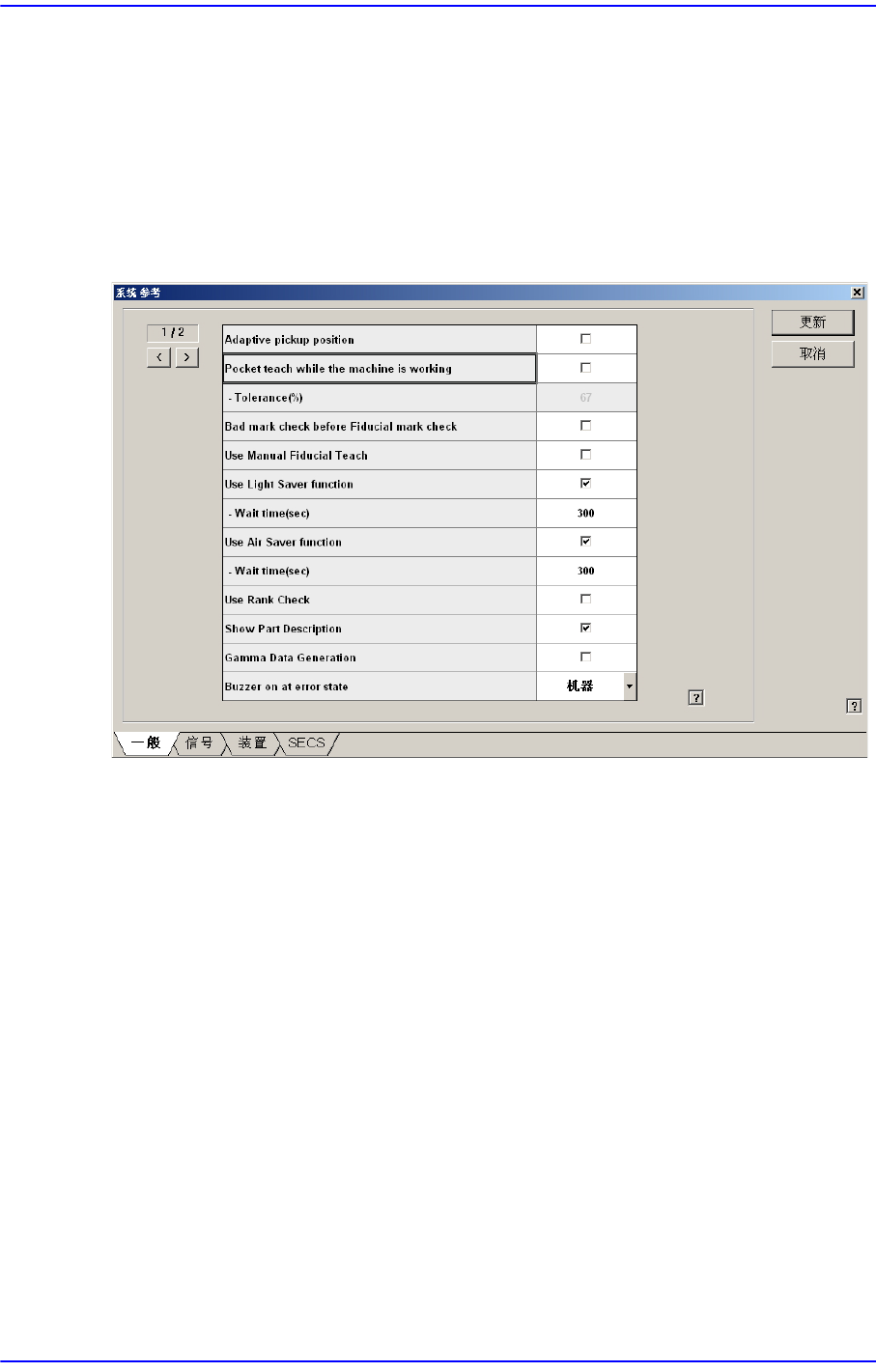 15-40 Advanced Chip Shooter DECAN S2 Administrator’s Guide 15.5. Pref. [F10] 设定设备的运用所必要的各种选项 。 选择此按钮时显示如下的对话框。 15.5.1. < 一般 > TAP 对话框 设置与设备运用有关的一般事项。 图 15.15 “System Preference” 对话框中 “ 一般 ”’ TAP 对话框 < 适当的拾料位置 …