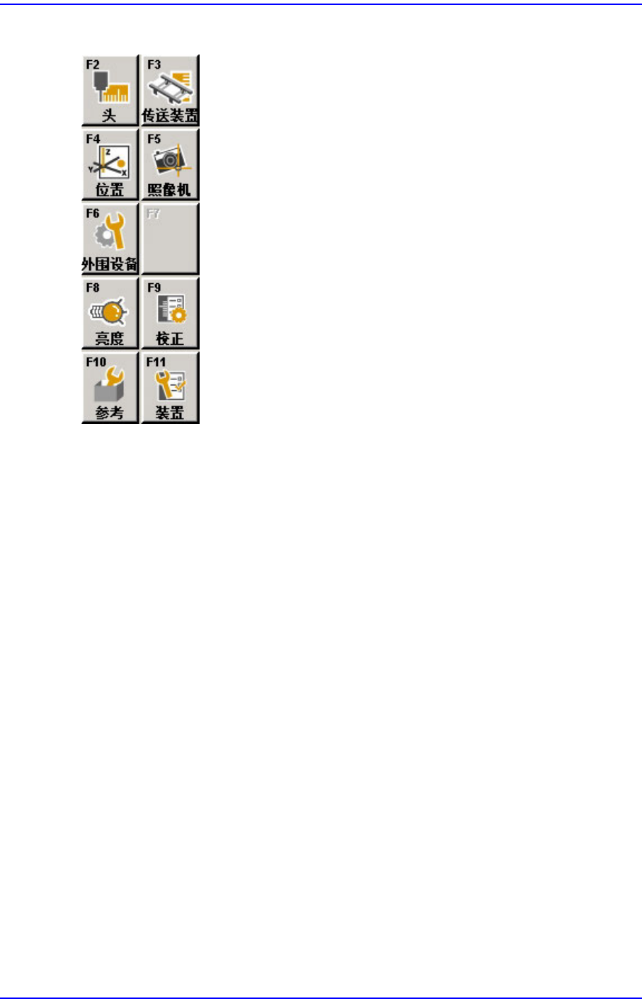 2-9 MMI 的菜单结构 2.1.2.2.5. ‘ 系统设定 ’ 菜单工具栏的下级辅助菜单工具栏 头 (Head) 校正与 Head 有关的事项。 传送装置 ( Conveyor ) 设置与输送机有关的事项。 位置 (Position) 设置与喂料器底座和系统翻斗壳 ( Dump box ) 有关的事项。 照像机 (Came ra) 设置与 Camera 及照明有关的事项。 外围设备 (Peripherals). …