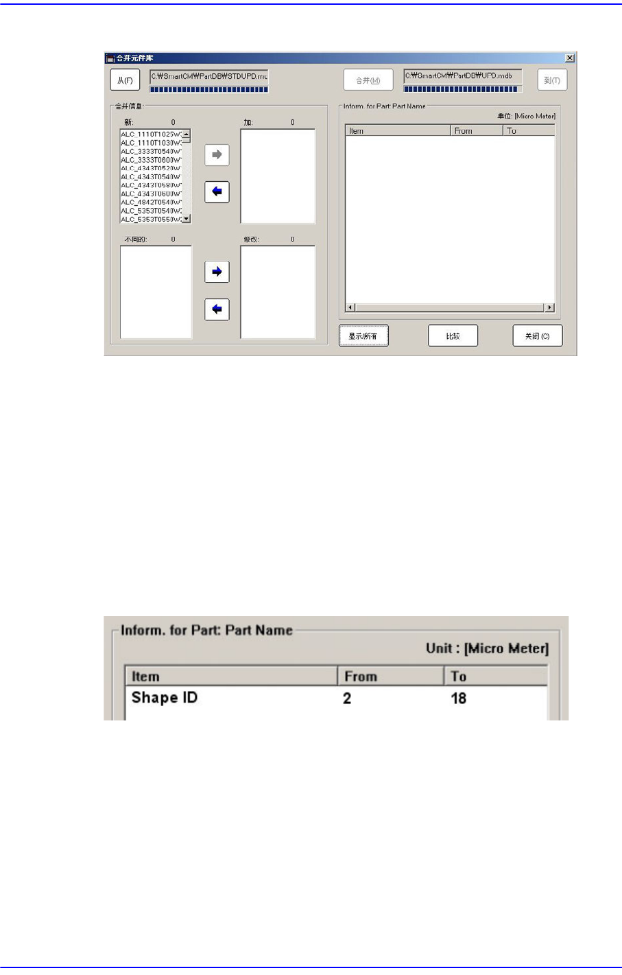 3-12 Advanced Chip Shooter DECAN S2 Administrator’s Guide 件的数据。 <Show> 按钮 有 “Show: ALL” 和 “Show: DIF F” 两种功能。 单击此按钮则两种功能轮着变更 。 <Show: ALL> 选择 〈新 : 〉 目录框或 〈异 : 〉 目录框的部 件名则在 〈 Inform.For Part : Part Name 〉 …