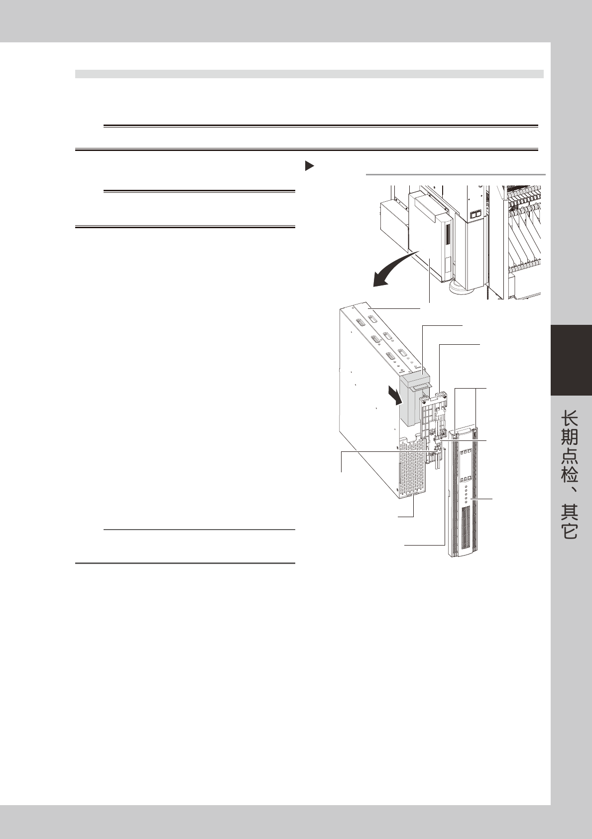 4-3 4 2.2 UPS 蓄电池的更换 蓄电池有一定的使用寿命。根据使用环境,使用寿命会有所不同,但一般建议 3 年左右最好更换 1 次蓄电池。 下面,介绍更换 UPS 内置蓄电池的方法。 w 警告 更换蓄电池,必须由有电工操作经验以及专业知识的人员进行。 1 切断贴片机的电源。 w 警告 请勿在紧急停机等状态下更换蓄电池。因为,此时 UPS 还处 于工作状态,非常危险。 2 拆卸正面面板。 用十字螺丝刀拆下固定正面面板的装配螺钉。 …