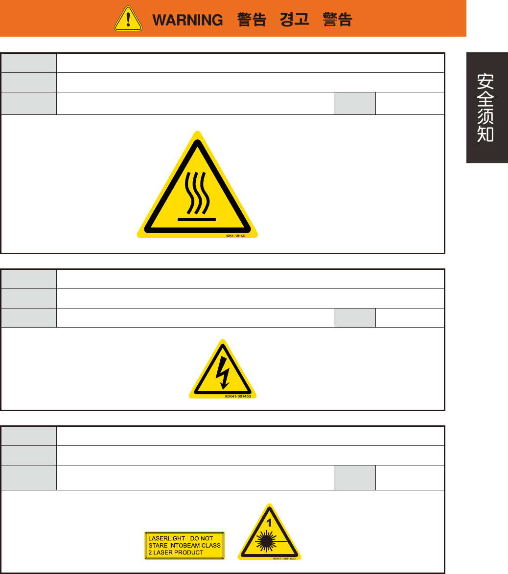 xiv 3.2.3 对人体的影响 危险结果 有触电的危险。 安全防范 请勿用手触摸或拆卸电极。请勿向电极淋水。 对象 配备静电消除器 ( 选配 ) 的机器 警告阶段 所有作业 可造成触电和故障的原因。 别用手触摸电极部位。 不可私自拆分部件。 请避免部件接触水分并远离极度潮湿环境。 To prevent the electric shock or damage. Do not touch electrodes. Do not disas…