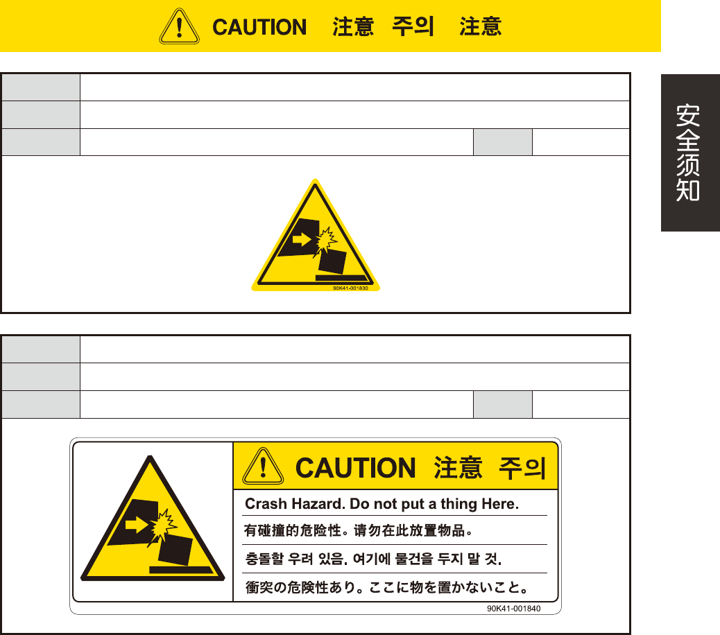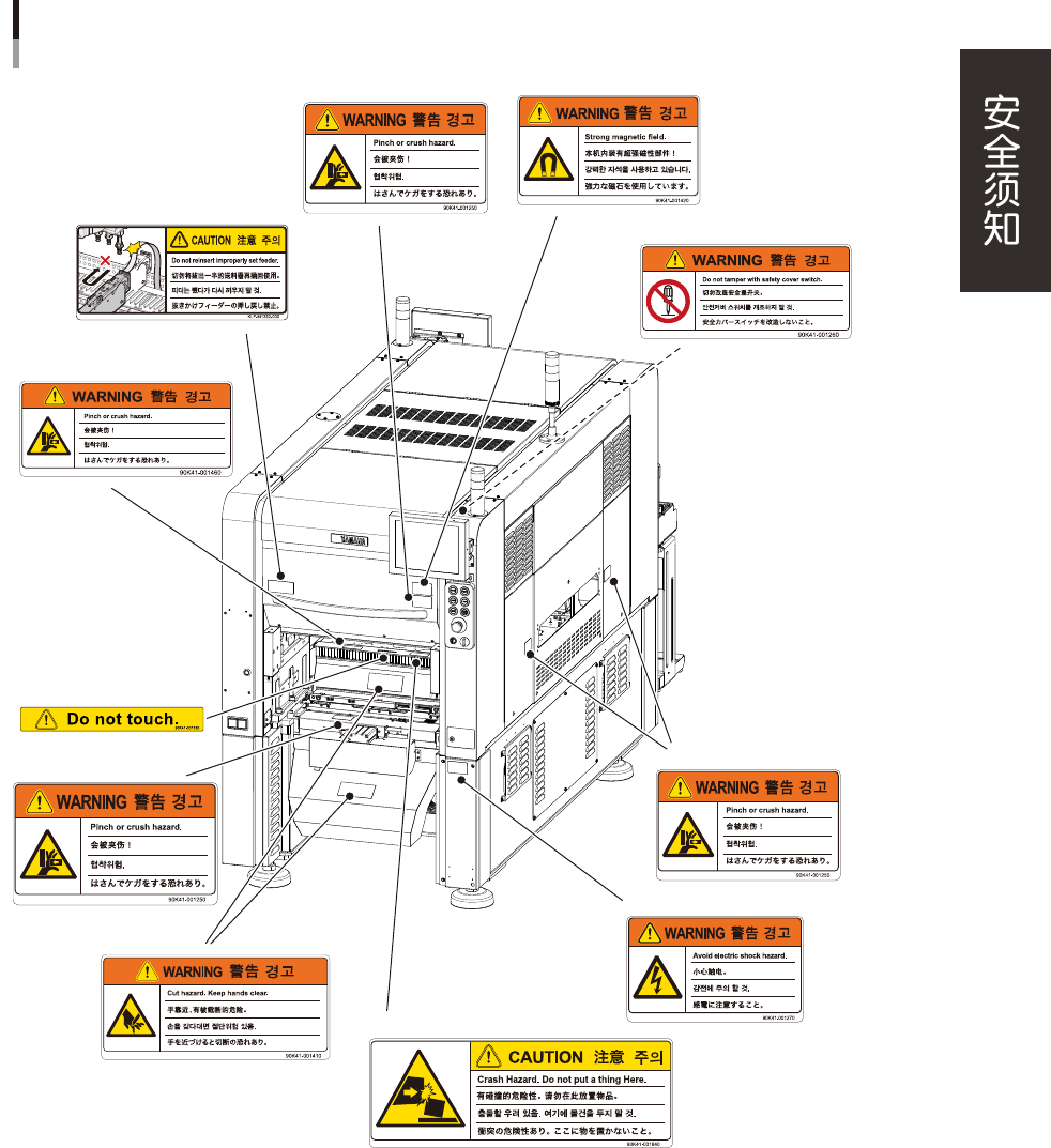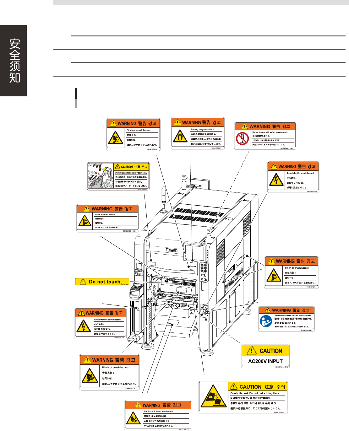 为了安全使用机器,如下图所示,在设备各个部位张贴了警告标贴,务必严格遵守标贴指示。此外,关于本节所
