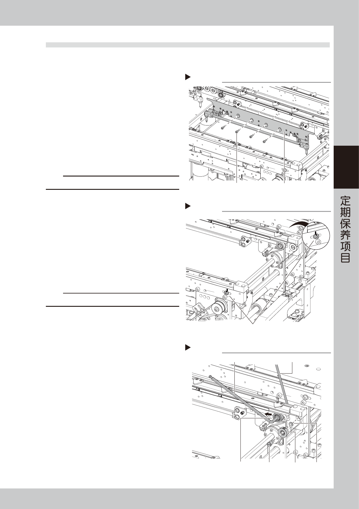 3-54 3 5.2.2 剪式齿轮的清洁与加油 一般,1 年左右需对剪式齿轮进行 1 次清洁与加油。下面,介绍清洁与加油的方法。 1 进行作业前的准备。 e 1. 将易受磁场影响的手表、ID 磁卡等随身物品全部取出。 2. 按急停按钮,打开贴片机的安全机盖。 3. 将料车从贴片机上卸下。 4. 将贴装头单元移到便于清洁剪式齿轮的位置之后,将方巾垫在下方。 2 拆卸齿轮盖。 用内六角扳手 (2.5) 拆下齿轮盖的 3 根固定螺栓。 3 清…