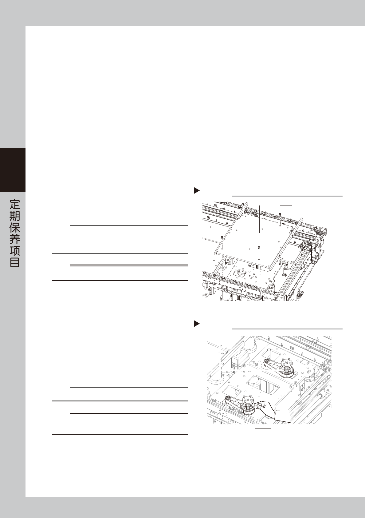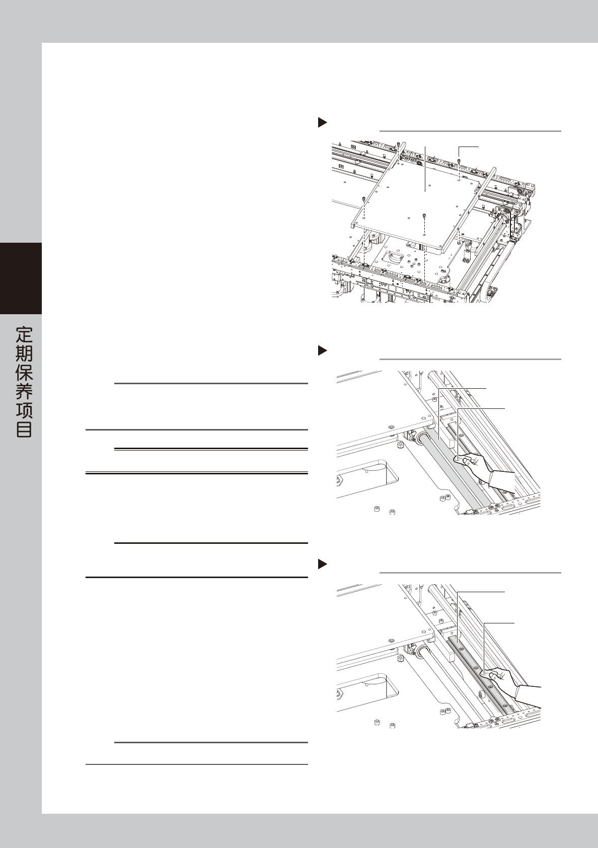 3-59 3 8 给滚珠丝杆涂抹润滑油。 用手指将指定的润滑油 (NSL) 均匀地涂抹在滚珠丝 杆的表面及螺旋槽部。 9 给导轨添加润滑油。 用润滑油枪 (30°弯折型枪嘴 ) 将指定的润滑油 (NSL) 从 W 轴导轨用注油嘴注入。 0 给滚珠丝杆上还未涂抹到的部位涂抹润 滑油。 1. 将料车安装在贴片机之后,解除贴片机的紧急 停机状态。 e 2. 用 [ 装置 ] -“传送装置”画面的手动按钮,将 传送宽度调窄之后,再次按急停按钮并…