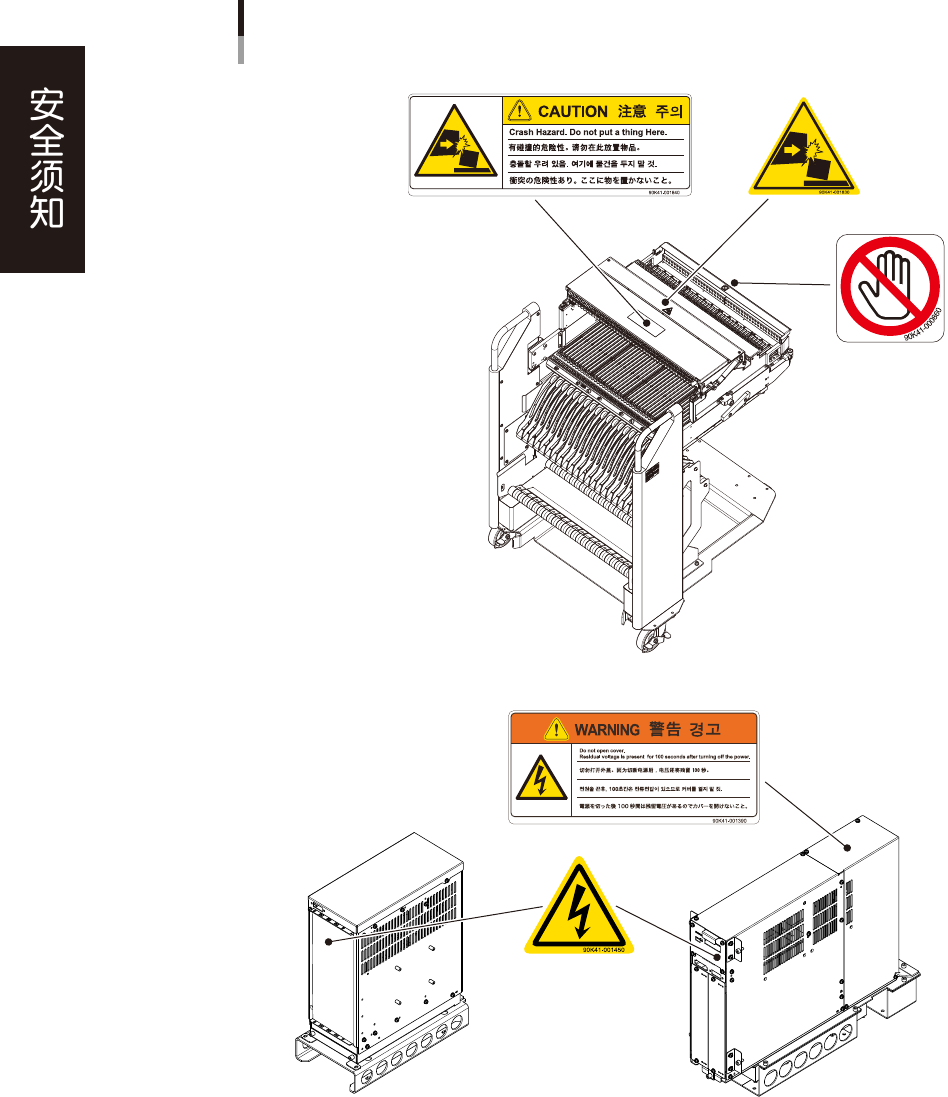 xi 当心触电。 可能会导致设备被损坏 ( 与贴装头发生碰撞等 ) 。 切断电源之后,请务必等待至少 100 秒才可以打开外盖。 请确认一次性换料车的顶部盖板上是否放置有物品。 可能会导致设备被损坏 ( 与贴装头发生碰撞等 ) 。 当心触电。 请确认一次性换料车的顶部盖板上是否放置有物品。 在通电状态下,请勿触摸。 有损坏设备的危险。 请勿对料车的盖板施加强力或撞击。