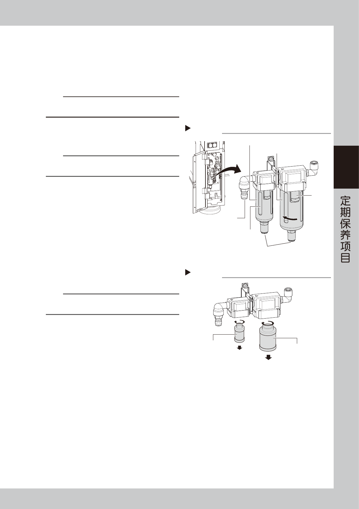 3-63 3 5.4.2 气、雾过滤器的清洁与滤芯的更换 本贴片机的气源连接部装有空气过滤器与油雾过滤器,以防止空气压缩机内的油、水、不纯物等进入机器内部。 下面,介绍这些过滤器的点检、清洁与滤芯的更换方法。 1 拆卸空气连接器。 为保障作业安全, 需拆下气源连接部的空气连接器。 c 注意 拆卸时会发出很大的排气声,务必注意安全。 此外,还需注意勿使油、水、不纯物等飞溅出来。 2 检查过滤杯内部。 目视检查过滤杯内是否有油或水。若有,需…